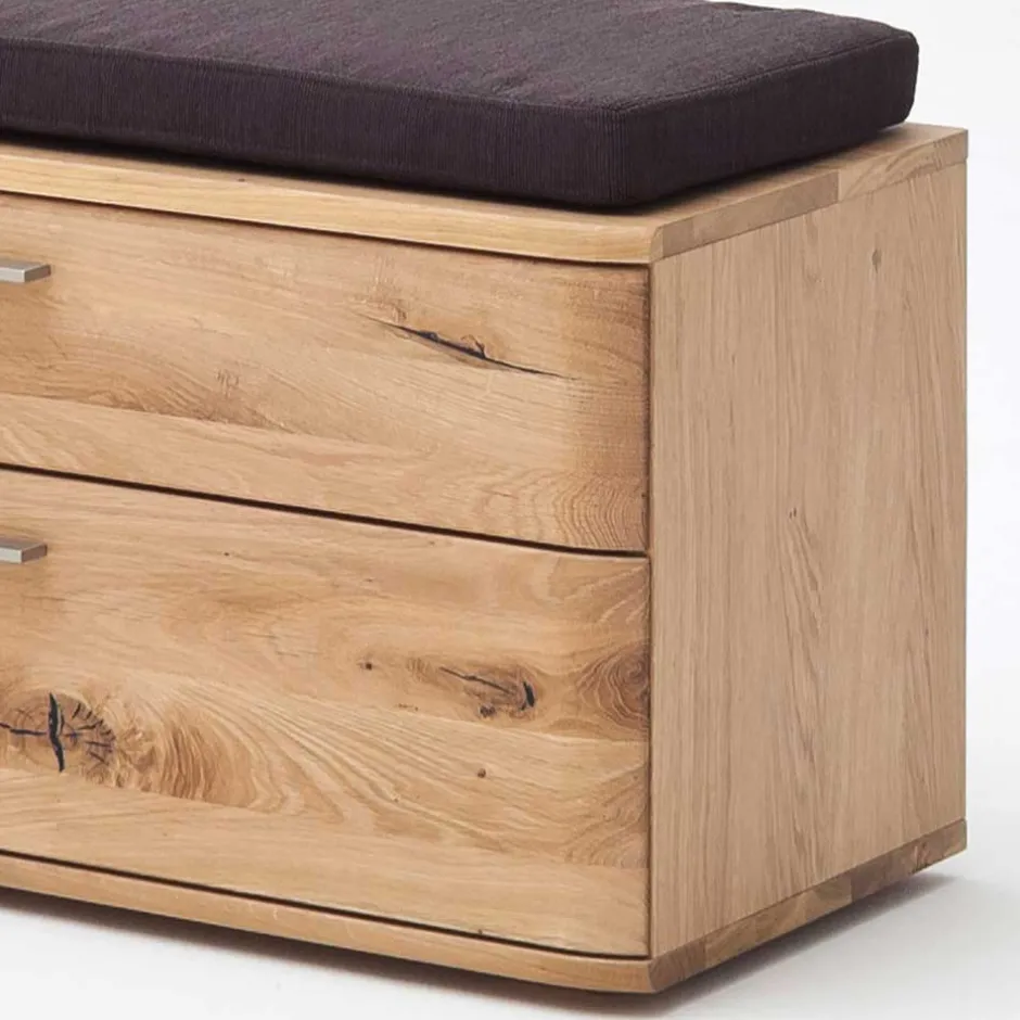 Diese stilvolle Garderobenbank wurde aus massivem Eichenholz für die Front und Spanplatte für den Korpus gefertigt. Die Front besticht durch ihren Balkeneiche-Look, der hell geölt wurde, während der Korpus außen mit einem Eiche-Echtholzfurnier in hellem Öl behandelt wurde. Innen ist der Korpus mit einem Holzdekor in Eiche Bianco foliert. Diese Kombination verleiht der Garderobenbank einen eleganten und zeitgemäßen Look.