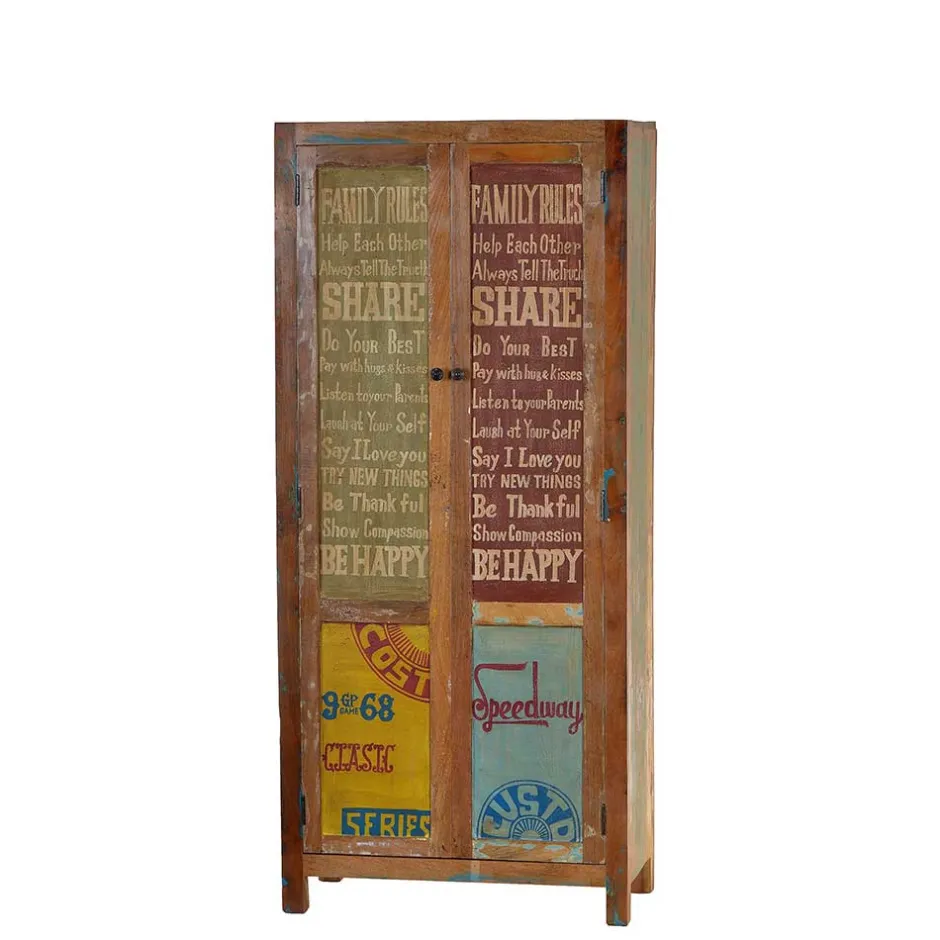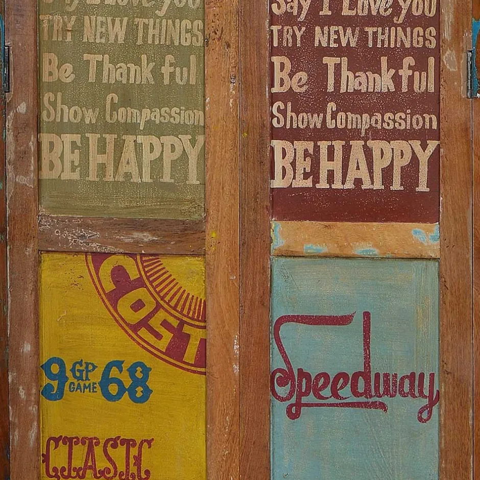 Kunstvolle Details, die begeistern Neben seiner beeindruckenden Haltbarkeit und Umweltfreundlichkeit besticht der Schrank „Creek“ durch seine kunstvollen Fronten. Die lackierte, pflegeleichte Oberfläche zeigt originelle Motive mit Buchstaben und Zahlen, inspiriert von alten Werbungen. Diese detailreichen Verzierungen machen den Schrank zu einem unverwechselbaren Blickfang in Ihrem Dielen- oder Wohnbereich.