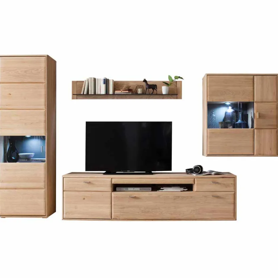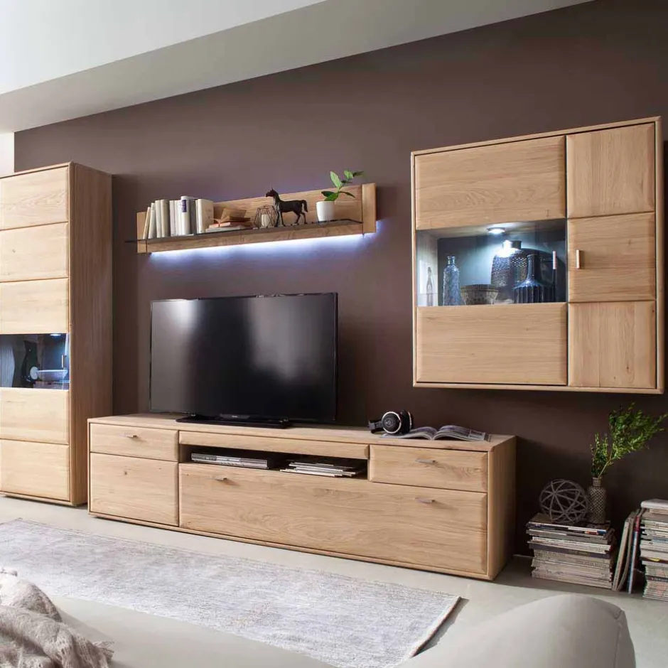 Die „Vernella“ Wohnwand besteht aus einer Vitrine, einem Hängeschrank, einem TV-Board und einem Wandboard. Die Fronten der Einzelteile sind aus massiver Eiche gefertigt, einem Holz, das für seine Robustheit, Langlebigkeit und unverwechselbare Maserung bekannt ist. Der Korpus ist aus hochwertiger MDF hergestellt, einem Material, das für seine glatte Oberfläche und Formstabilität geschätzt wird. Mit diesen Qualitätsmaterialien und einer sorgfältigen Verarbeitung ist die „Vernella“ Wohnwand ein Produkt, das lange hält und mit der Zeit noch schöner wird.