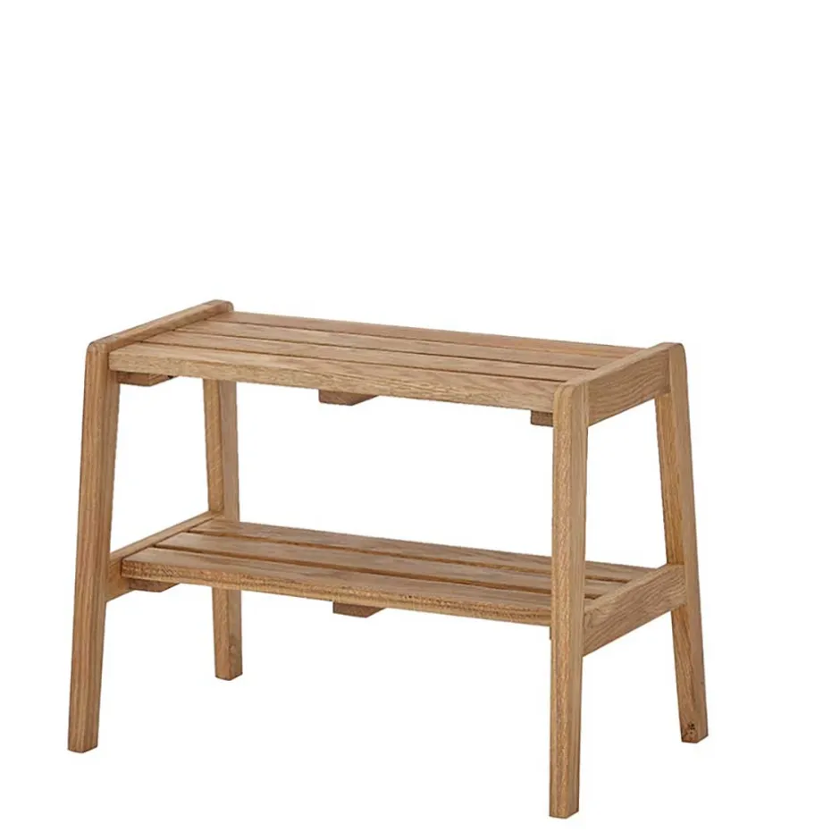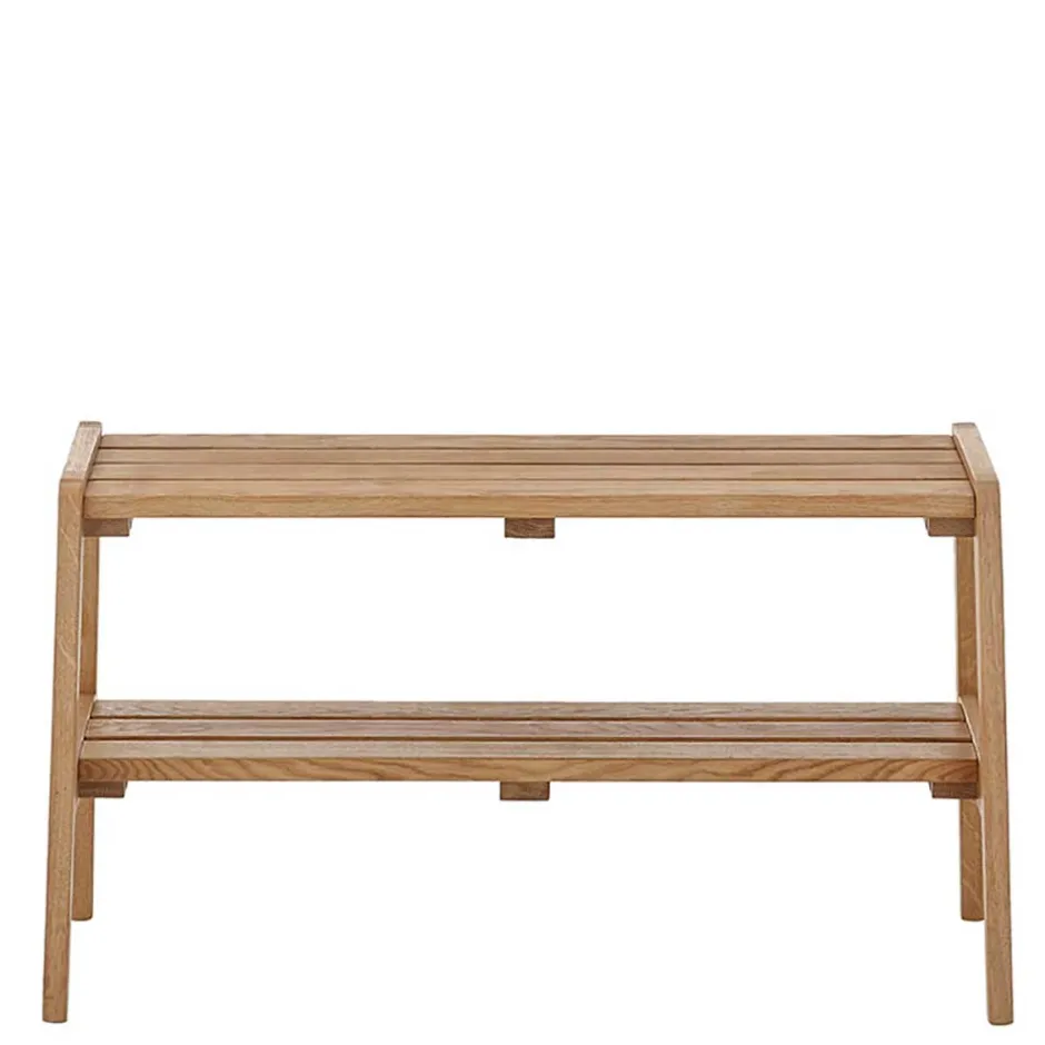 Mit einer Sitzfläche, die aus vier stabilen Holzleisten besteht, bietet die Bank eine bequeme Sitzmöglichkeit für eine Person und trägt ein Gewicht von bis zu 80 kg. Unterhalb der Sitzfläche befindet sich eine zusätzliche Ablage, die ebenfalls aus massiven Holzleisten gefertigt ist und ideal für die Aufbewahrung von Schuhen oder anderen Gegenständen genutzt werden kann. Das Fußgestell in A-Konstruktion sorgt für einen sicheren Stand und verleiht der Bank einen modernen, aber gleichzeitig klassischen Look.