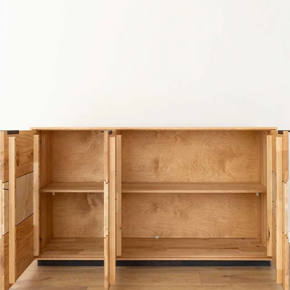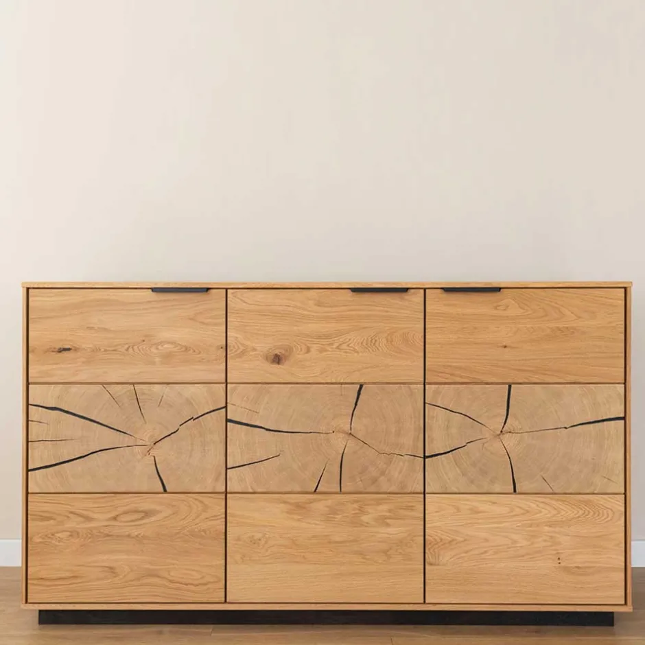 Gefertigt aus massivem Eichenholz, steht das Sideboard „Deruta“ für Qualität und Langlebigkeit. Die natürliche Maserung des Holzes wird durch die geölte Oberfläche besonders betont und verleiht dem Möbelstück eine lebendige, warme Ausstrahlung. Der mittlere Frontbereich ist mit stilvollen Hirnholz-Applikationen versehen, die einen spannenden Kontrast zur übrigen Front bilden. Dezente, schwarze Metallgriffe und ein ebenfalls schwarz abgesetztes Sockelgestell runden das Design ab und unterstreichen die moderne Ästhetik.
