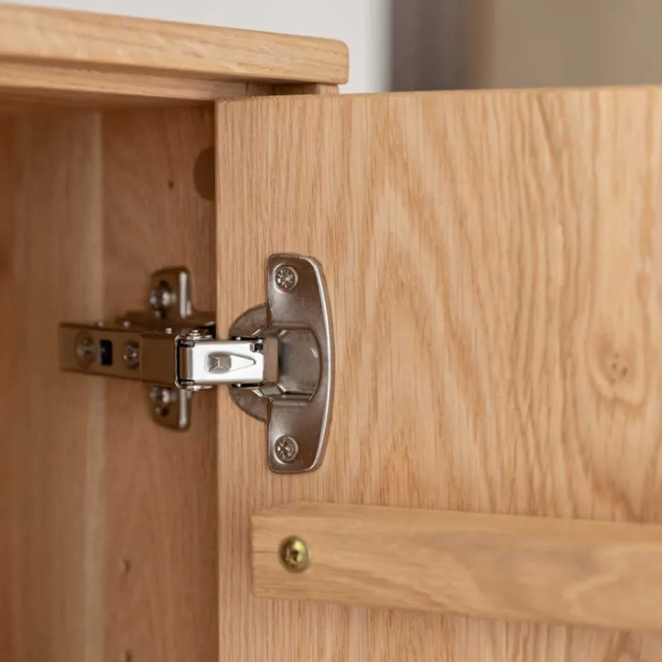 Hinter den drei Drehtüren, die mit Soft-Close-Metallbeschlägen ausgestattet sind, bietet das Sideboard großzügigen Stauraum. Zwei Einlegeböden im Inneren schaffen Ordnung und ermöglichen eine flexible Aufbewahrung von Geschirr, Büchern oder Deko-Elementen. Die sanft schließenden Türen sorgen für ein geräuscharmes Öffnen und Schließen, was die Handhabung besonders angenehm macht.