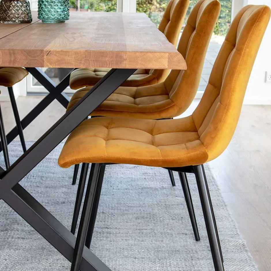 Mit einer Tischplatte aus massivem Eichenholz bringt „Valco“ die Natur in Ihr Esszimmer. Jede Tischplatte ist etwa 4 cm stark und längs geteilt, was nicht nur eine ansprechende Optik, sondern auch ein individuelles Erscheinungsbild bietet. Besonders hervorzuheben sind die einzigartig gewachsenen Baumkanten, die bei jedem Tisch anders verlaufen, da sie direkt aus dem Baumstamm geschnitten werden. Diese Kanten bringen die natürliche Schönheit des Holzes besonders zur Geltung und machen jeden Tisch zu einem echten Unikat. Das X-förmige Stahlgestell in Schwarz sorgt dabei für außergewöhnliche Stabilität und eine interessante Linienführung – ein echter Hingucker, der Design und Funktion perfekt vereint. Diese Konstruktion bietet zudem den Vorteil einer optimalen Gewichtsverteilung und eines sicheren Stands, selbst bei hoher Beanspruchung.