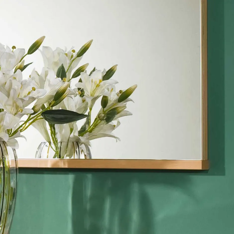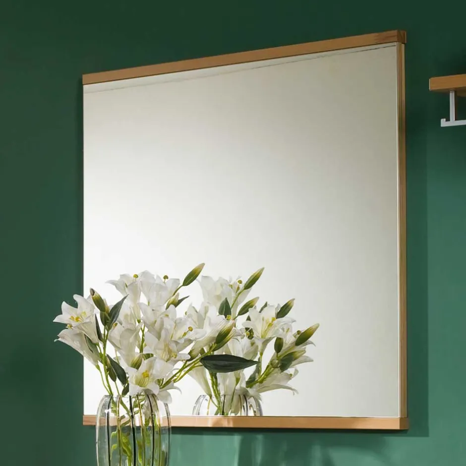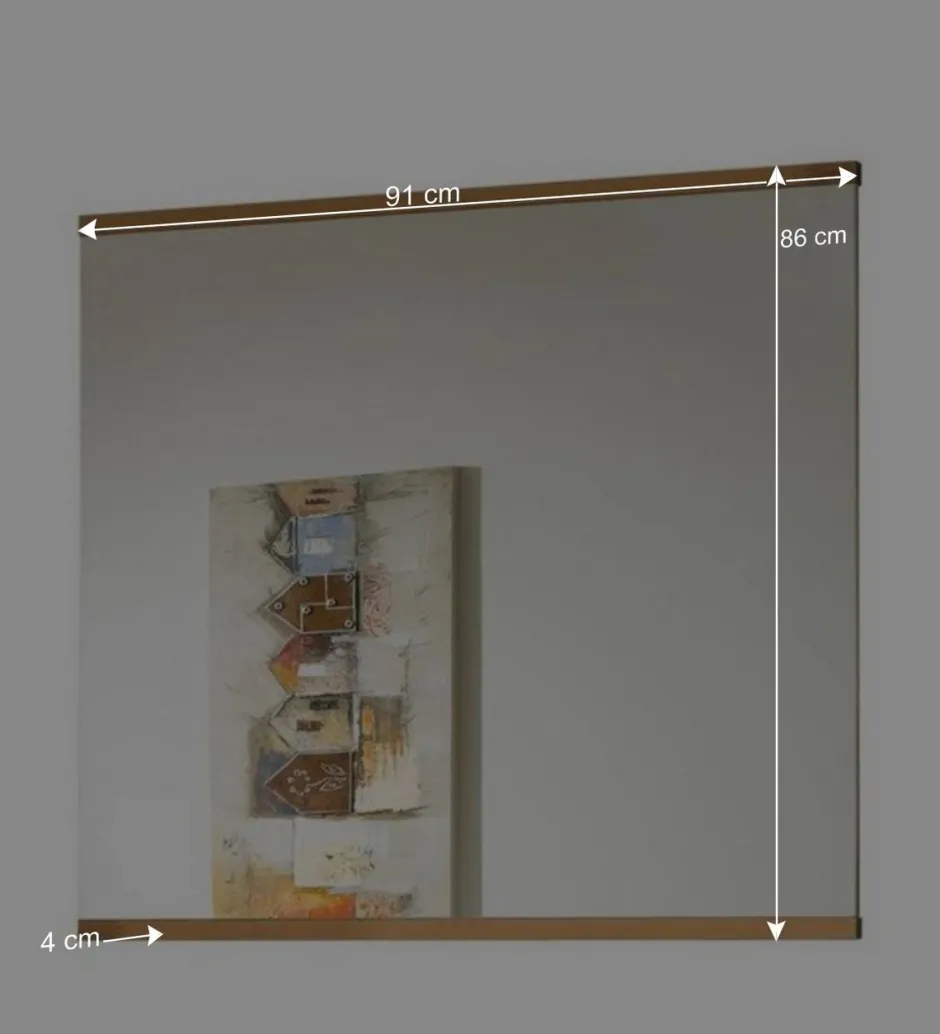 Mit den Maßen 91 cm Breite, 86 cm Höhe und 4 cm Tiefe ist der Spiegel ideal dimensioniert. Die sichtbaren Holzleisten oben und unten rahmen den Spiegel perfekt ein und verleihen ihm eine strukturelle Präsenz.