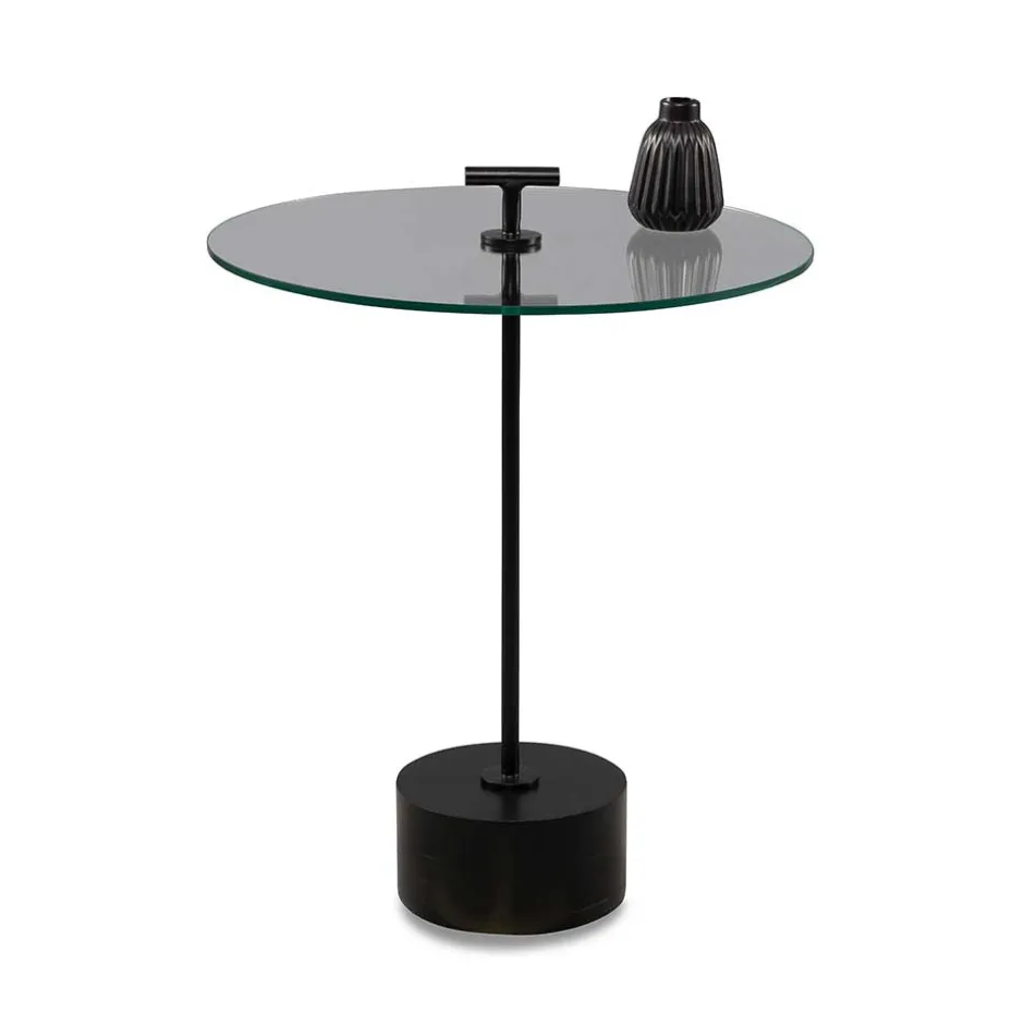Das schwarze Säulengestell aus Metall verleiht dem Tisch eine moderne Silhouette, während der Sockel aus schwarz lackiertem Akazienholz den natürlichen Charakter unterstreicht. Die elegante runde Form und die strapazierfähigen Oberflächen lassen den Beistelltisch nicht nur edel wirken, sondern machen ihn auch pflegeleicht im täglichen Gebrauch.