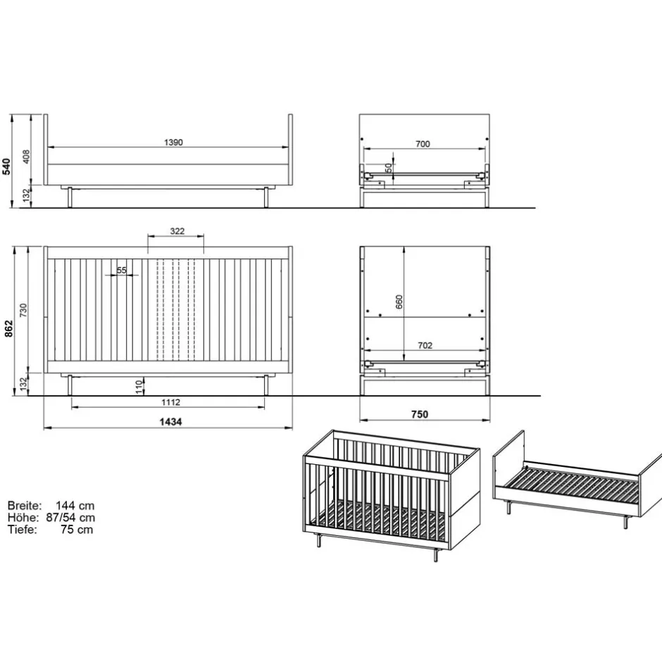 Ein besonderes Highlight sind die mitgelieferten Umbauseiten: Damit verwandelt sich das Kinderbett im Handumdrehen in ein Juniorbett, das bis ins Grundschulalter genutzt werden kann. Das spart nicht nur Geld, sondern auch Nerven – denn Ihr Kind kann sich weiterhin auf seinen vertrauten Schlafplatz verlassen. Die empfohlene Matratzenhöhe liegt bei 13 cm (nicht im Lieferumfang enthalten). Das Bett ist bis zu 100 kg belastbar.