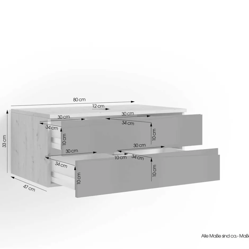 Mit einer Breite von 80 cm, einer Höhe von 33 cm und einer Tiefe von 47 cm fügt sich der Waschtisch harmonisch in Ihr Badezimmer ein. Der Oberboden ist mit einer maximalen Belastbarkeit von 40 kg ein zuverlässiger Partner im Alltag. Trotz seiner Stabilität wiegt das Möbelstück lediglich ca. 25,88 kg, was die Montage und Umgestaltung erleichtert.