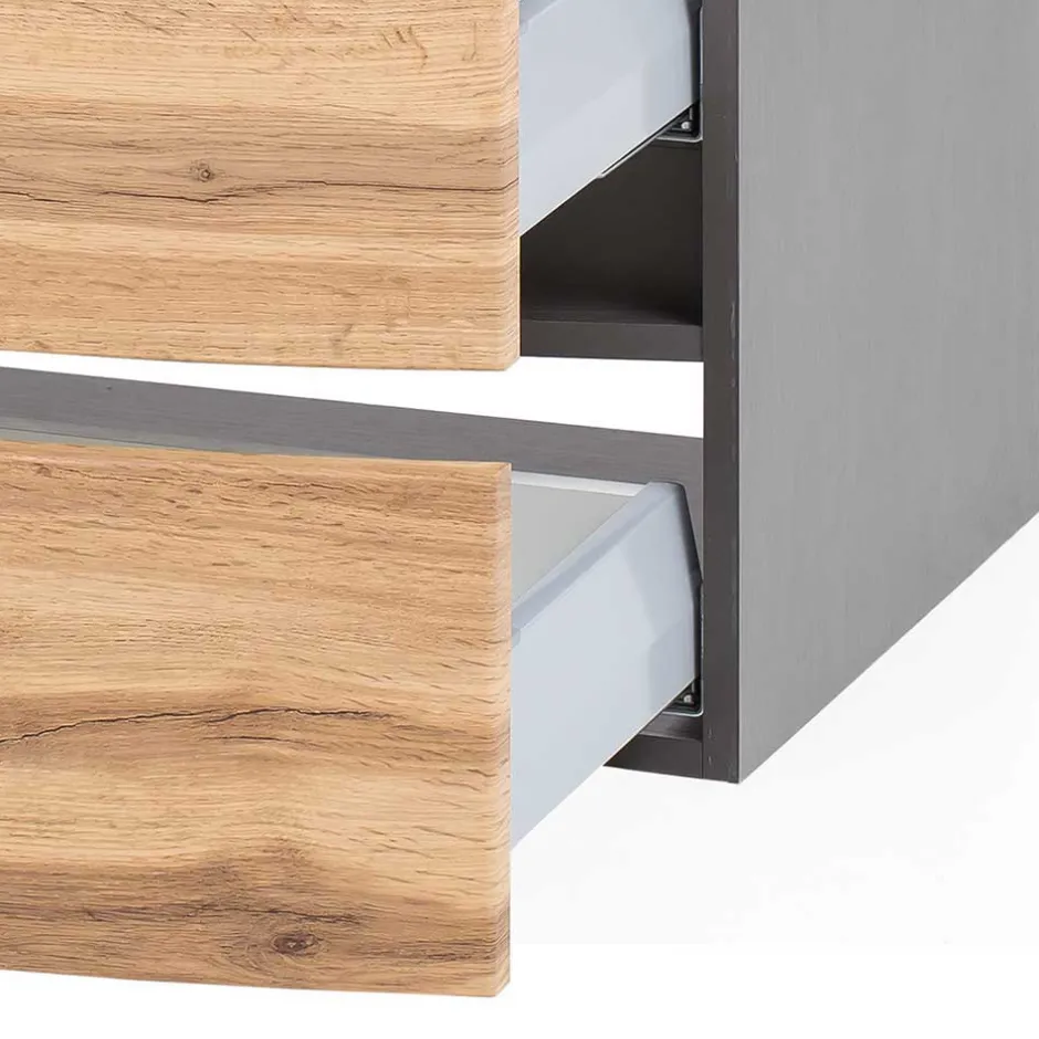 Modernes Design bedeutet hier mehr als nur klare Linien. Es steht für ein harmonisches Zusammenspiel von Eleganz und Funktion. Der formschöne Waschtisch in edlen Wildeichefarben und Dunkelgrau bringt Wärme und zeitgemäße Klarheit in Ihren Raum. Während die wildeichefarbene Front eine natürliche, wohnliche Note vermittelt, sorgt der dunkelgraue Korpus für Tiefe und einen stilvollen Kontrast – eine Kombination, die Ihr Bad zu einem Ort moderner Behaglichkeit macht.