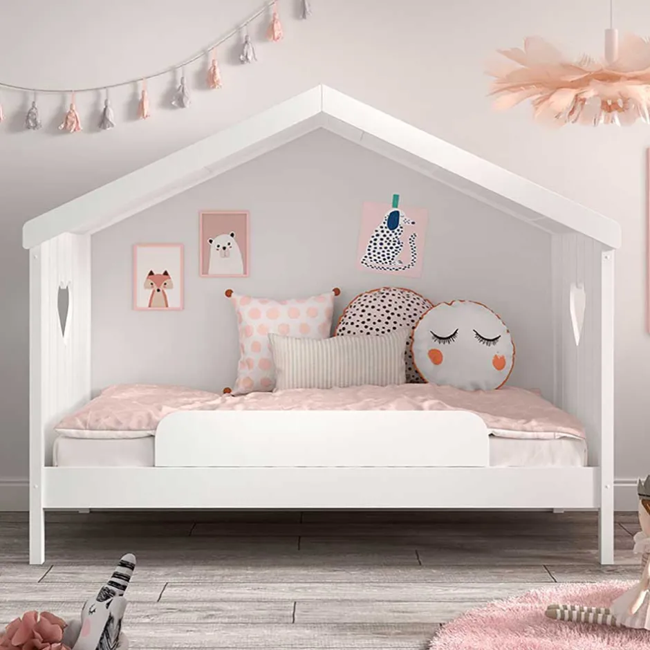 Willkommen im Reich der Träume! Das Kinder Hausbett Grandory aus dem Wohnen.de Shop ist weit mehr als nur ein Bett. Es ist eine außergewöhnliche Schlafstätte, die mit ihren hohen Seitenelementen, dem imposanten Kopfteil und dem hohen Fußteil in geplankter Optik alle Blicke auf sich zieht. Das romantisch-wohnliche Design dieses Bettes wird durch herzförmige Öffnungen im Kopf- und Fußteil perfekt abgerundet.