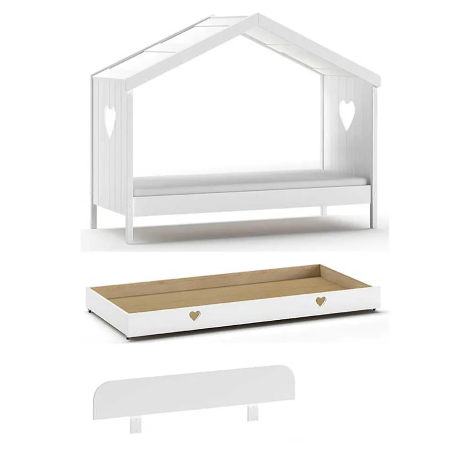 Das Hausbett benötigt eine Stellfläche von mindestens 213 cm in der Breite, 172 cm in der Höhe und 99 cm in der Tiefe. Es besteht aus widerstandsfähiger MDF-Platte und Kiefer Massivholz mit einer lackierten Oberfläche in strahlendem Weiß. Die Metallbeschläge sorgen für eine langlebige Funktionalität.