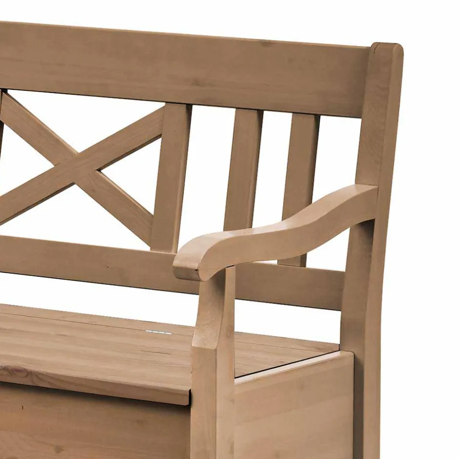 Mit einer angenehmen Sitzhöhe von ca. 49 cm und einer Sitztiefe von 43 cm bietet die Eckbank „Giurgia“ außergewöhnlichen Sitzkomfort. Die stilvolle Rückenlehne ist mit senkrechten Streben und eleganten X-Elementen verziert, was der Bank einen Hauch rustikalen Charmes verleiht und zugleich Stabilität garantiert. Die leicht geschwungenen Armlehnen sorgen für zusätzlichen Komfort und laden zum Verweilen ein. Ein praktisches Plus: Die Sitzfläche ist aufklappbar und verbirgt darunter einen großzügigen Stauraum, ideal für Kissen, Decken oder andere Kleinigkeiten, die Sie immer griffbereit haben möchten.