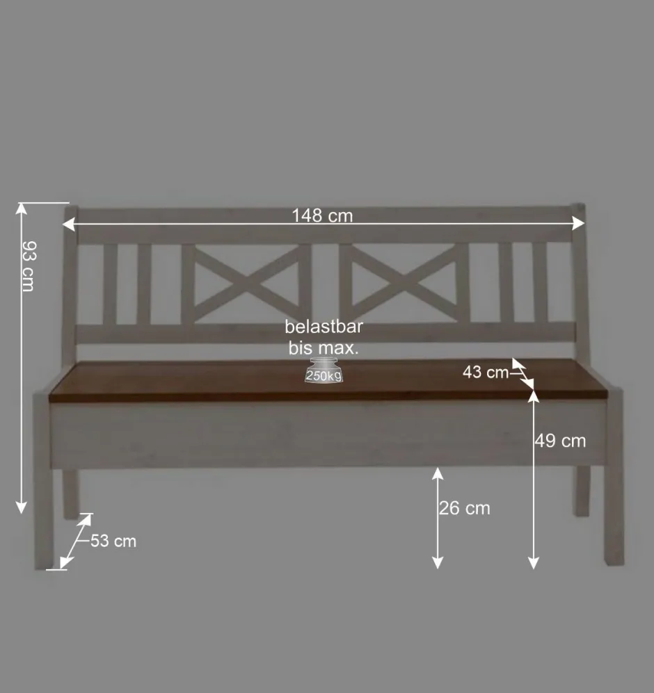 Die Sitzfläche der Bank ist gleichzeitig eine Klappe, die Zugang zu einer geräumigen Truhe bietet. Dieser Stauraum ist ideal für Kissen, Decken oder andere Gegenstände, die Sie griffbereit, aber dennoch ordentlich verstaut haben möchten. Die maximale Belastbarkeit von 250 kg garantiert, dass die Bank sowohl robust als auch praktisch ist.