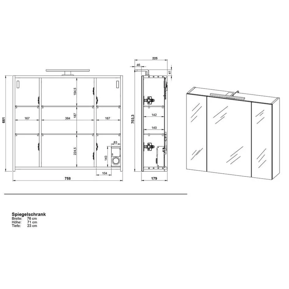 - Der Spiegelschrank (75,8×66,1×17,9 cm, ca. 21,18 kg): Drei Spiegeltüren bieten eine großzügige Spiegelfläche, während verstellbare Glasböden innen flexible Stauraummöglichkeiten schaffen. Besonders praktisch: Eine integrierte Schalter- und Steckdosenkombination für Rasierer oder elektrische Zahnbürsten.