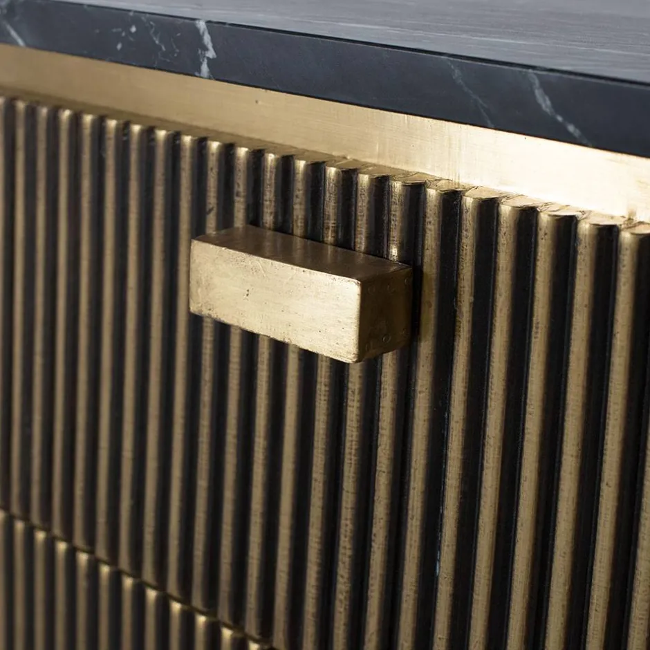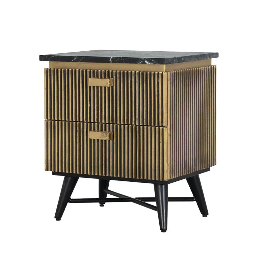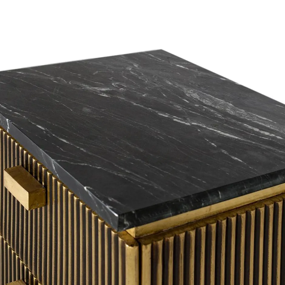 Die Nachtkommode „Hayato“ beeindruckt durch die Verwendung erstklassiger Materialien. Die Deckplatte besteht aus edlem schwarzem Marmor, der nicht nur robust, sondern auch besonders stilvoll ist. Das Korpusmaterial aus massivem Mangoholz sorgt für Stabilität und eine natürliche Ausstrahlung. Die Oberfläche ist lackiert, um die natürliche Schönheit des Holzes zu unterstreichen und gleichzeitig langlebig zu machen. Das schwarz lackierte Metalluntergestell mit seinen konisch zulaufenden Beinen verleiht der Kommode eine filigrane Leichtigkeit, während bronzefarbene, rechteckige Griffe und ein plastisches Rillenmuster den eleganten Retro-Look abrunden.