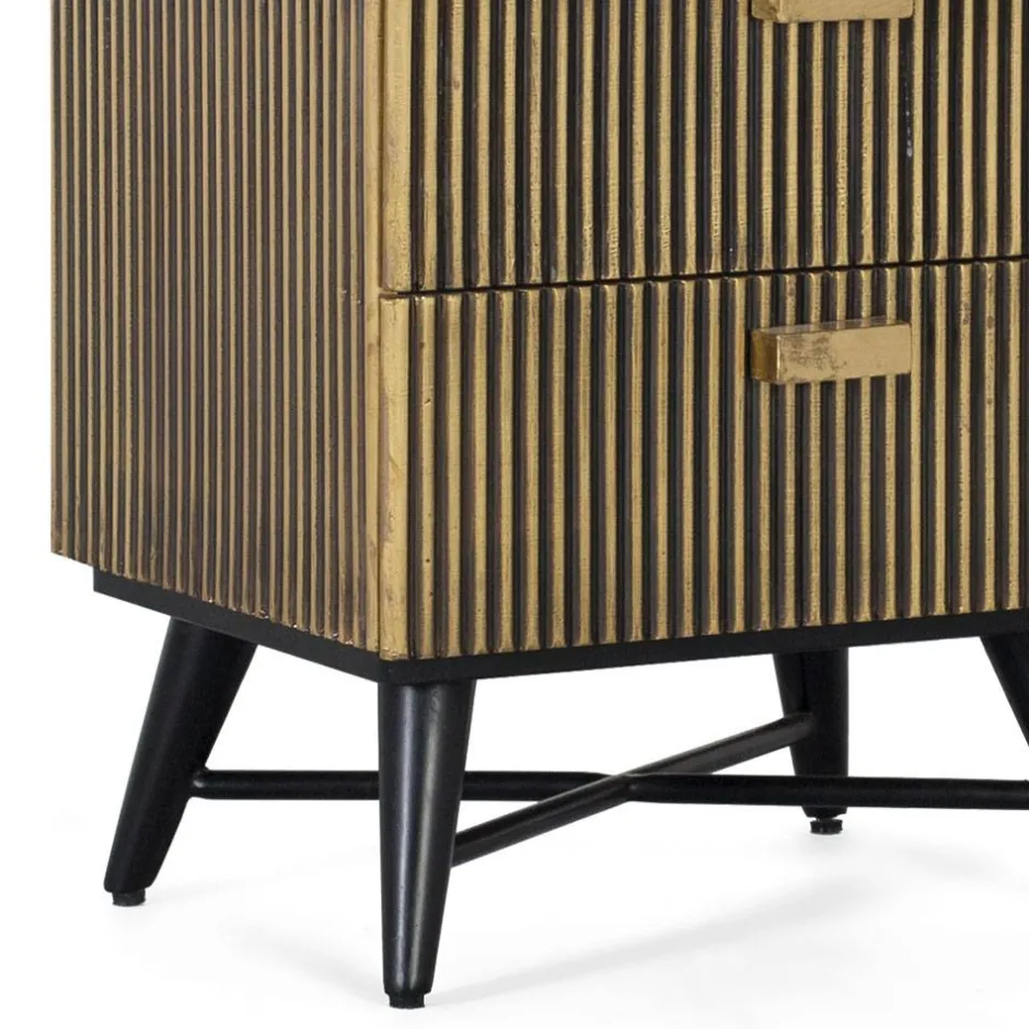 Setzen Sie auf zeitlose Eleganz und einzigartiges Design mit der Nachtkommode „Hayato“. Dieses außergewöhnliche Möbelstück in Schwarz und Bronze verbindet Retro-Charme mit moderner Raffinesse und wird so zum Blickfang in Ihrem Schlafzimmer. Die harmonische Kombination aus hochwertigen Materialien und kunstvoller Verarbeitung macht jedes Stück zu einem Unikat. Hergestellt in aufwendiger Handarbeit, zeichnet sich die Kommode durch ihre individuelle Ausstrahlung und kleine, charmante Unterschiede in Form, Farbe und Maßen aus. Die schwarz lackierten Oberflächen und bronzefarbenen Akzente fügen sich perfekt in ein gehobenes Wohnambiente ein.