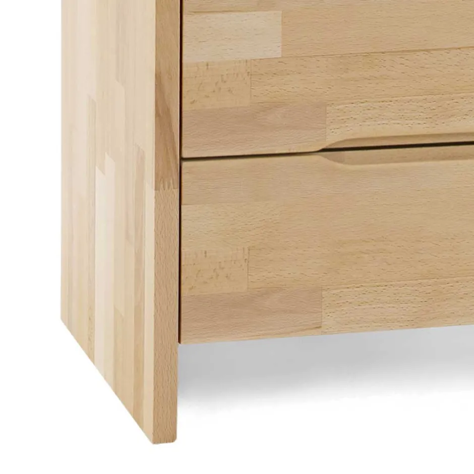 Kernbucheholz, bekannt für seine beeindruckende Härte und die lebendige Maserung, verleiht „Devenia“ seinen unverwechselbaren Charakter. Durch die hochwertige Stabverleimung, ein Prozess, bei dem einzelne Holzleisten miteinander verleimt werden, gewinnt die Kommode an Stabilität und zeigt eine faszinierende Musterung, die jedes Exemplar zu einem Unikat macht. Die natürliche Ölung der Oberfläche unterstreicht nicht nur die warme Ausstrahlung der Kernbuche, sondern bietet auch Schutz und erleichtert die Pflege des Holzes, sodass Sie lange Freude an diesem Möbelstück haben werden.