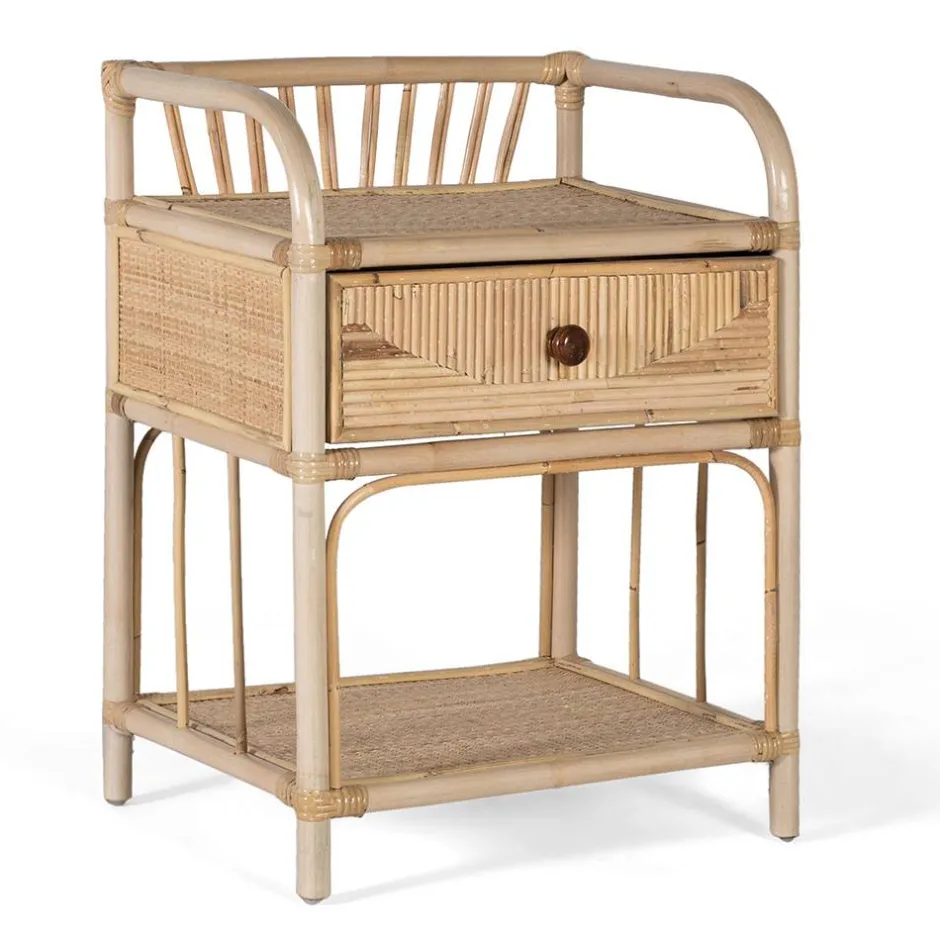 Gefertigt aus robustem Rattan überzeugt die Nachtkonsole durch ihre Stabilität und natürliche Ausstrahlung. Das stabile Untergestell sorgt für einen festen Stand, während die handgefertigten Oberflächen dem Möbelstück eine besondere Wertigkeit verleihen. Der runde Knopfgriff aus braunem Holz rundet das Gesamtbild stilvoll ab.