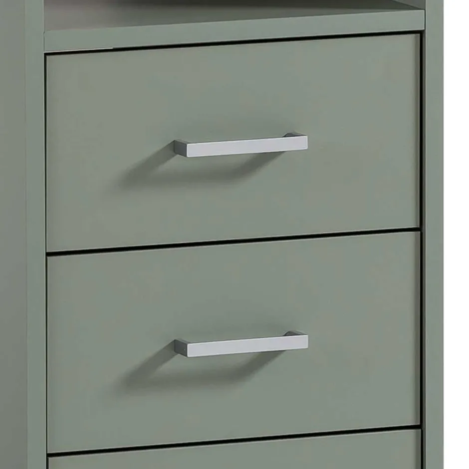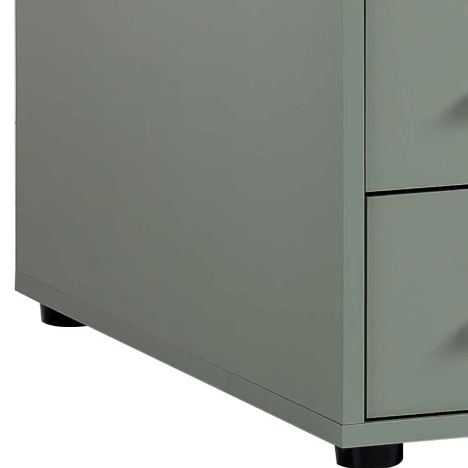 Die klare rechteckige Form und die moderne Oberfläche in Graugrün sorgen für einen frischen, zeitgemäßen Look, der sich harmonisch in unterschiedlichste Einrichtungsstile einfügt. Die melaminbeschichtete Oberfläche sieht nicht nur gut aus, sondern überzeugt auch mit praktischen Eigenschaften: Sie ist besonders pflegeleicht, kratzfest und resistent gegen Feuchtigkeit – ideal für den täglichen Einsatz.
