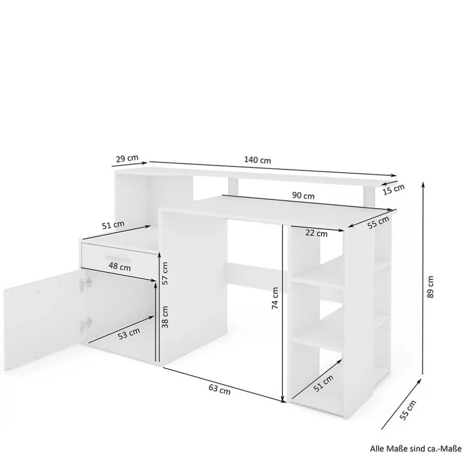 Mit einer Schublade inklusive Metallauszug, einer Ablage für den Drucker, drei offenen Regalfächern und einem großzügigen Staufach hinter der Tür bietet der Schreibtisch „Caveira“ vielfältige Stauraummöglichkeiten. Die Tischplatte mit einer Höhe von ca. 75,6 cm und einer Stärke von ca. 1,6 cm gewährleistet eine angenehme Arbeitsfläche. Zudem ist der Schreibtisch mit einer zusätzlichen Ablage für den Monitor und einer Knieraumblende ausgestattet, die ein komfortables Arbeiten ermöglichen.