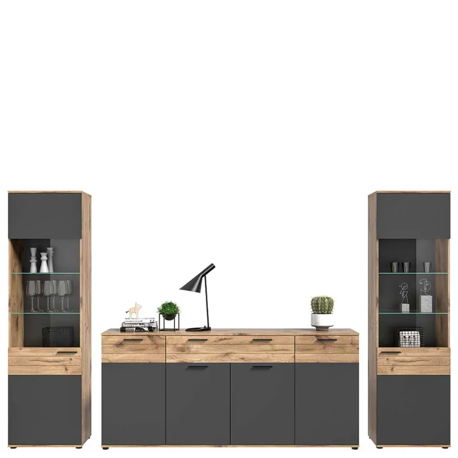 Die Oberflächenbeschichtung in Grau kombiniert mit der Wildeiche-Holzoptik verleiht dieser Wohnwand eine spannende zweifarbige Optik. Dieses harmonische Farbspiel setzt moderne Akzente in jedem Wohnbereich und lässt Ihr Interieur strahlen.