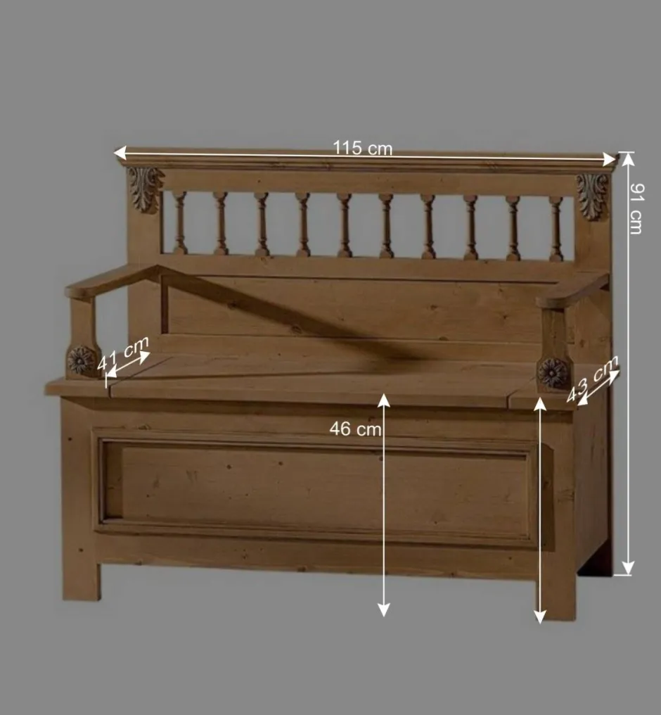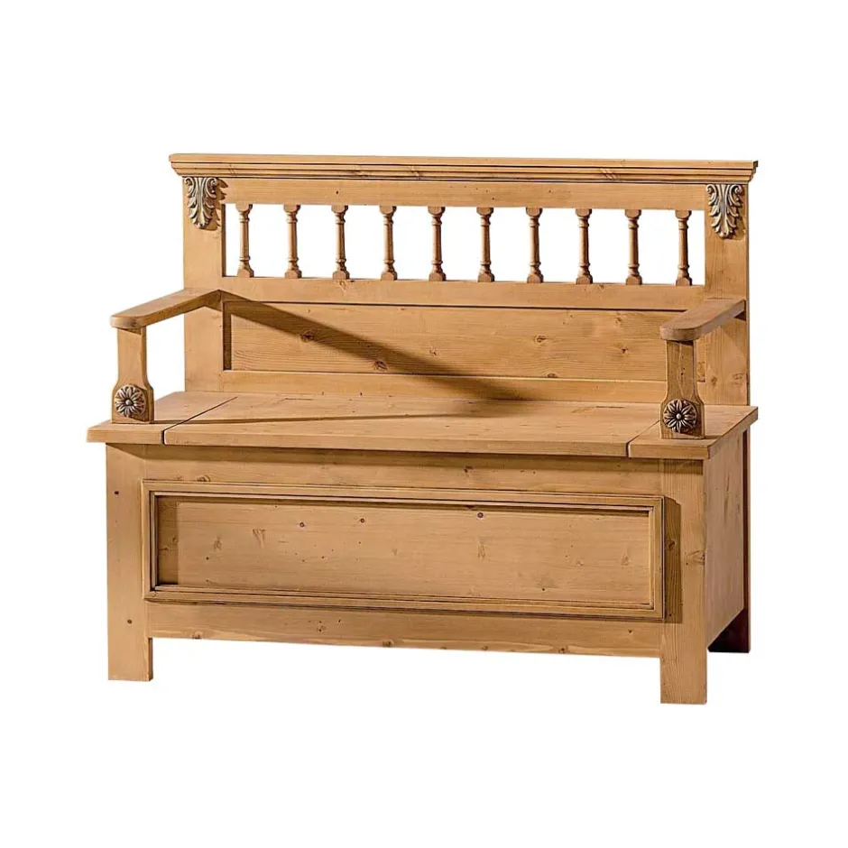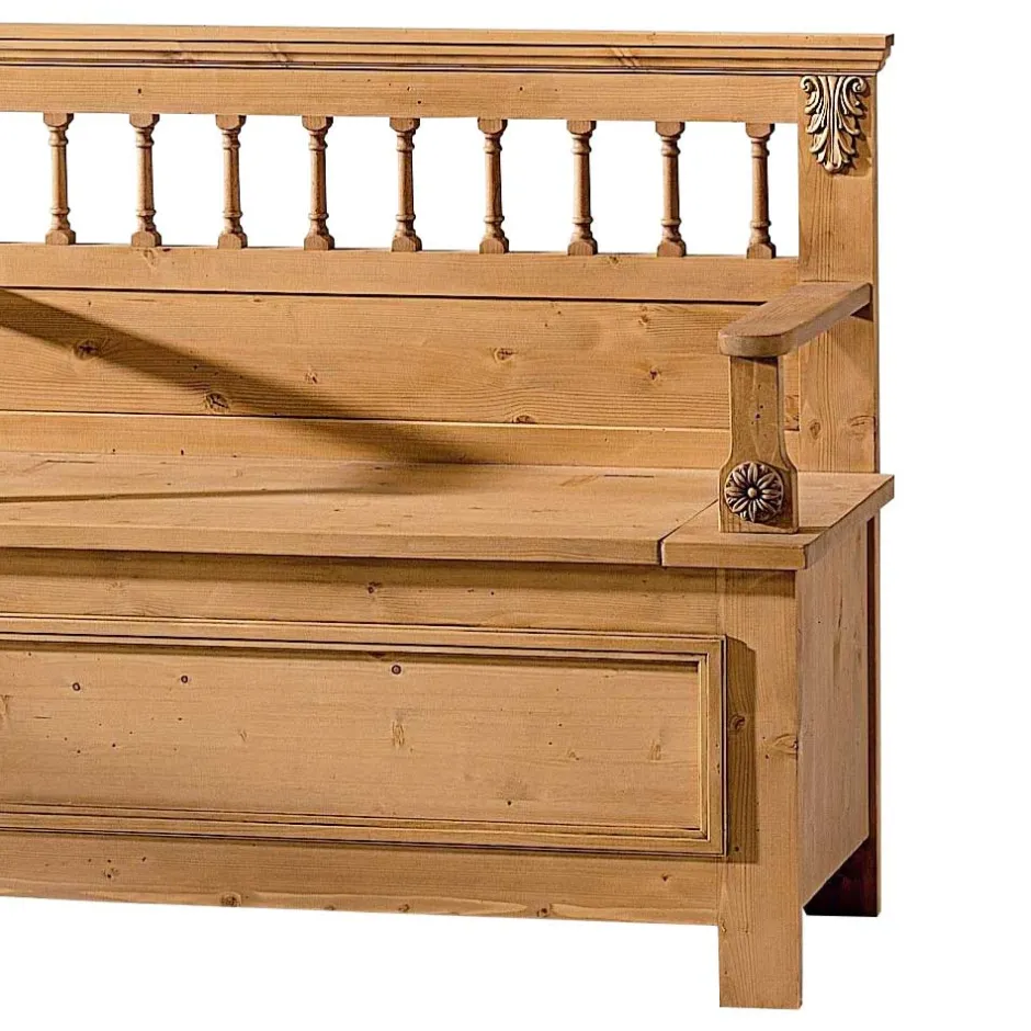 Die Truhenbank „Melessa“ ist nicht nur funktional, sondern auch äußerst komfortabel. Mit beidseitigen Armlehnen und einer Rückenlehne mit fein gedrechselten Verstrebungen bietet sie maximalen Sitzkomfort. Sie werden sich in diesem Möbelstück wohlfühlen und lange gemütliche Stunden verbringen.