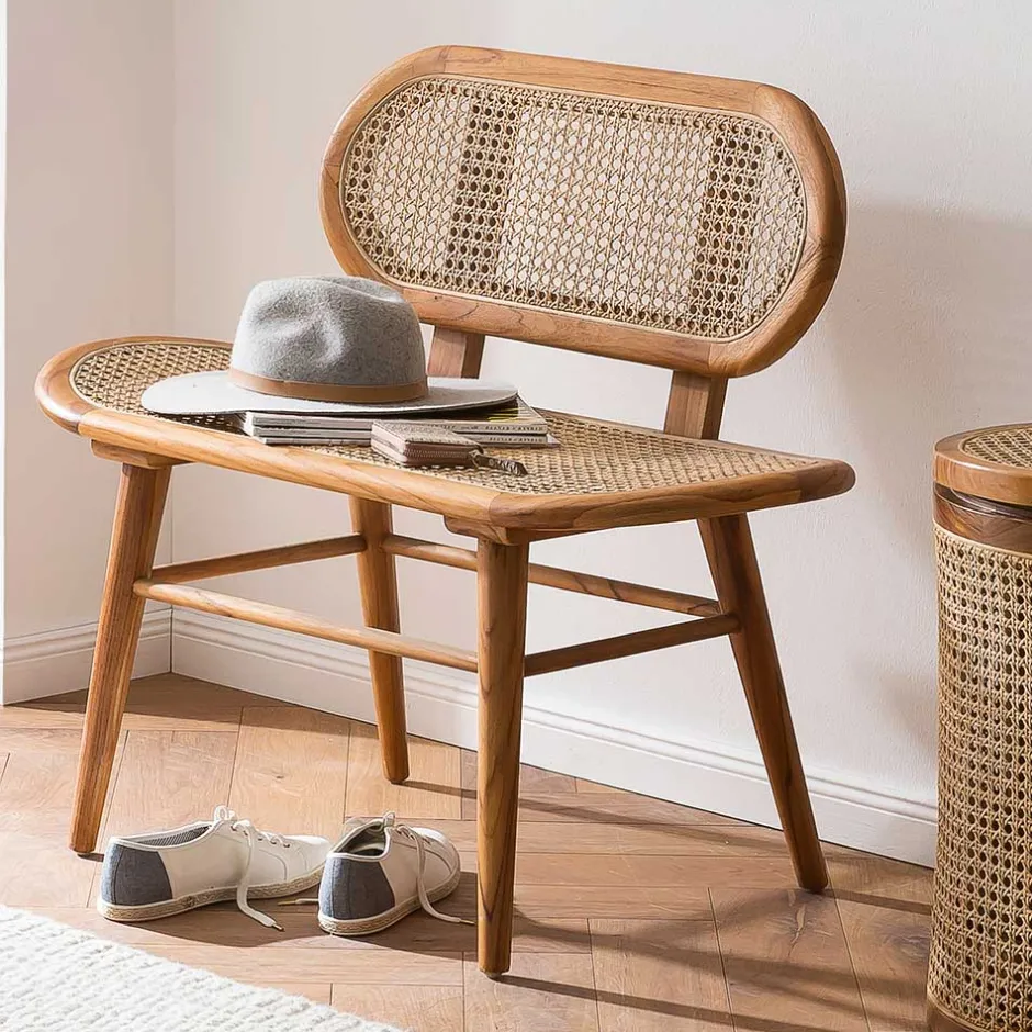 Ein echtes Highlight für Ihr Zuhause: Die Wohnraum-Bank „Feliana“ verbindet natürliche Materialien mit einer harmonischen Formensprache und avanciert so schnell zum stilprägenden Mittelpunkt Ihres Interieurs. Die Kombination aus warmen Teakholz-Tönen und filigranem Wiener Geflecht verleiht der Bank eine luftig-leichte Ausstrahlung, die sich ideal in Einrichtungen im beliebten Scandi Chic einfügt. Doch auch im Boho-Stil oder als Kontrastelement in modernen Wohnwelten entfaltet sie ihre volle Wirkung. Ob als gemütlicher Sitzplatz im Flur, als stilvolle Ablage im Schlafzimmer oder als dekorative Ergänzung im Wohnzimmer – „Feliana“ zeigt sich vielseitig einsetzbar.