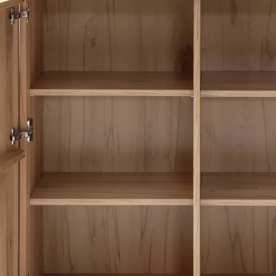 Oben befindet sich eine praktische Schublade mit Metall-Unterflurauszug und Soft-Close-Funktion, die sanft und geräuschlos schließt. Darunter verbergen sich zwei Drehtüren mit gedämpften Metallbeschlägen. Hinter jeder Tür finden Sie zwei verstellbare Einlegeböden (Materialstärke ca. 1,8 cm), die den Innenraum in drei übersichtliche Fächer unterteilen – perfekt für Geschirr, Bücher oder Dekorationen. Die Türen sind jeweils aus zwei Elementen interessant gestaltet und verleihen dem Vertiko eine moderne Optik.