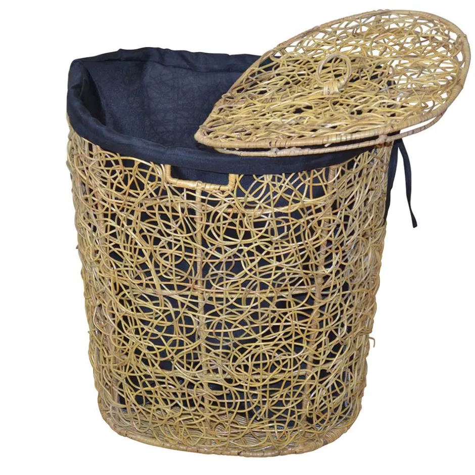 Der Wäschekorb „Sempra“ vereint kreative Flechtkunst mit funktionalem Design. In Natur gehalten und aus handgeflochtenem Rattanrohr gefertigt, beeindruckt er mit einer ausgefallen-unregelmäßigen Flechttechnik, die bewusst größere Zwischenräume lässt. Dadurch tritt das Stoffinlett optisch in den Vordergrund und beeinflusst die Gesamtwirkung des Korbes maßgeblich.