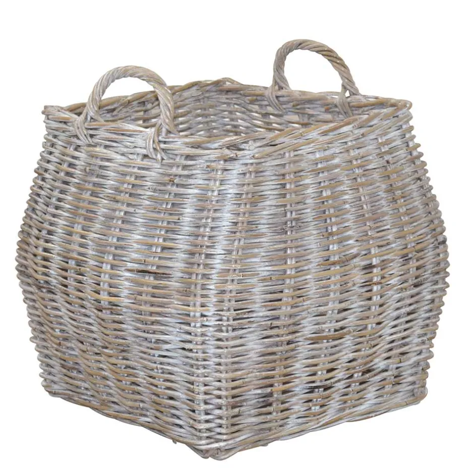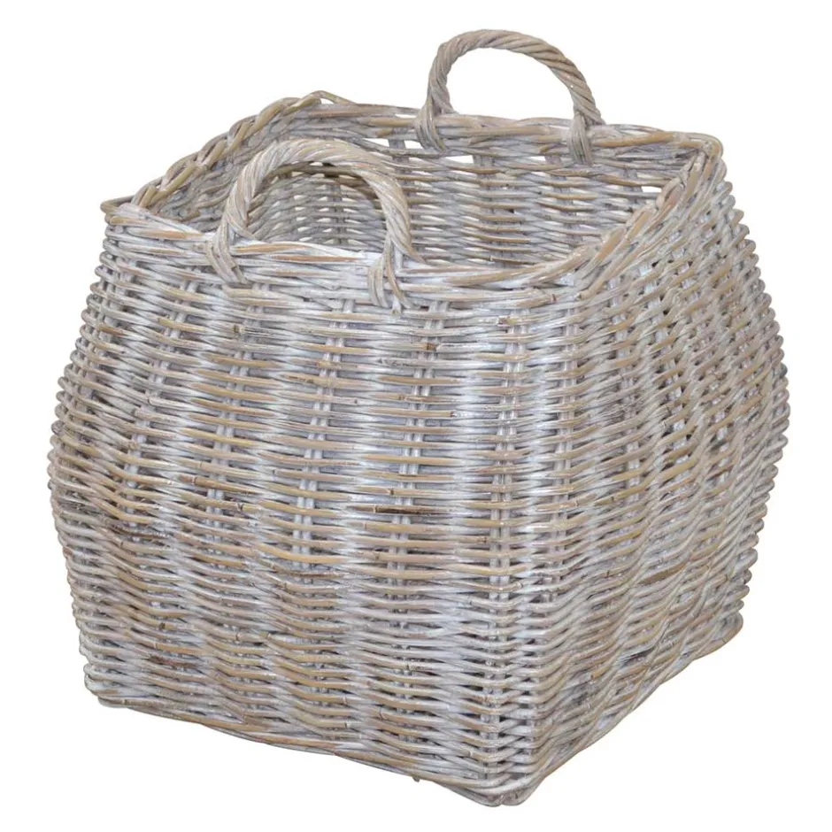 Handgeflochten aus Rattan, einem natürlichen und besonders robusten Material, überzeugt der Korb sowohl durch seine Langlebigkeit als auch durch seine geschmeidige Oberfläche. Rattan wird seit Jahrhunderten für die Herstellung von Möbeln und Accessoires verwendet und zeichnet sich durch seine Widerstandsfähigkeit und Flexibilität aus. Die Oberfläche des Korbes ist in einem trendigen Graubraun lackiert und mit einem sanften Weiß gewischt, was ihm einen charmanten Vintage-Look verleiht.