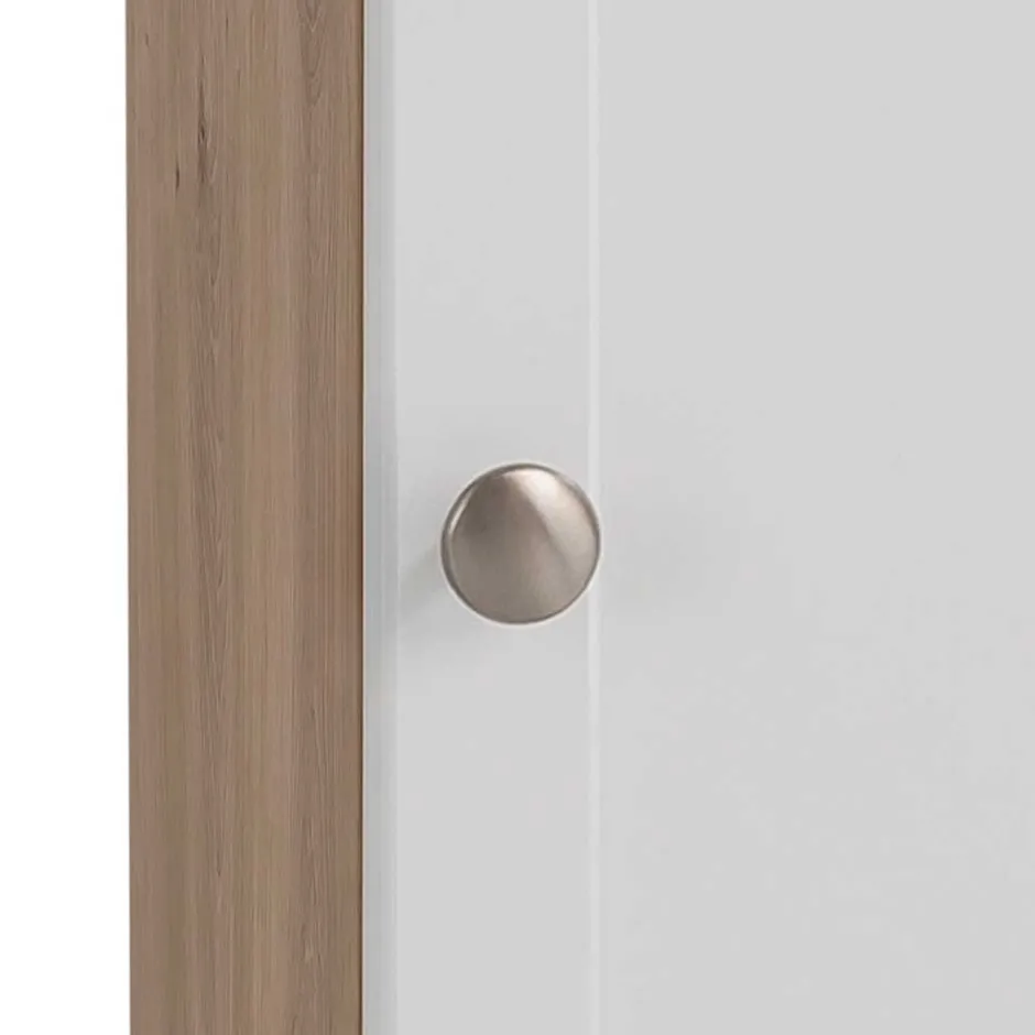 Die Spiegelfront besteht aus hochwertigem Spiegelglas, das nicht nur für eine brillante, verzerrungsfreie Reflexion sorgt, sondern auch den Raum optisch vergrößert und Licht optimal verteilt. Die MDF-Fronten bieten hervorragende Formstabilität und ermöglichen eine makellose weiße Folierung – gleichmäßig, pflegeleicht und strapazierfähig. Der Korpus ist aus robuster Spanplatte gefertigt und melaminbeschichtet: Diese Beschichtung schützt zuverlässig vor Feuchtigkeit, Kratzern und Abnutzung, während die Holzoptik in Wildeichefarben eine natürliche Wärme ins Design bringt. Tiefgezogene Kanten garantieren ein nahtloses Erscheinungsbild ohne sichtbare Übergänge – ein Detail, das nicht nur optisch überzeugt, sondern auch die Reinigung erleichtert.