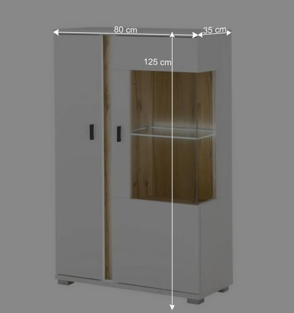 - Highboard (BxHxT: 80x125x35 cm): Zwei Türen, davon eine mit Glaseinsatz, bieten eine stilvolle Präsentation von Deko oder Gläsern. Drei Einlegeböden und ein Glasboden sorgen für durchdachten Stauraum.