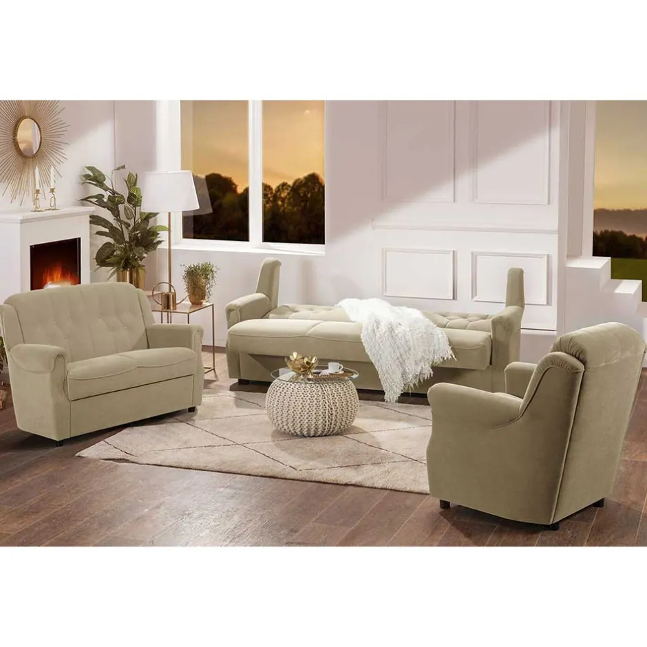 Die Couch-Garnitur „Mabu“ überzeugt mit einer edlen Formsprache, die durch geschmackvolle Zierknöpfe und dekorative Kedernähte kunstvoll in Szene gesetzt wird. Der klassische Stil vereint zeitlose Ästhetik mit einem Hauch von nostalgischem Charme – ideal für anspruchsvolle Wohnräume, in denen Eleganz und Gemütlichkeit gleichermaßen geschätzt werden. Die harmonische Farbgebung in Beige unterstreicht die stilvolle Optik und lässt sich wunderbar mit verschiedenen Einrichtungsstilen kombinieren.