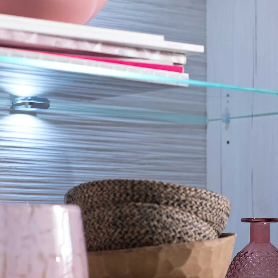 - Links eine Tür mit Glas, dahinter zwei verstellbare Glasböden, rechts eine Tür in Kassettenoptik, dahinter ein Konstruktions- und ein Einlegeboden