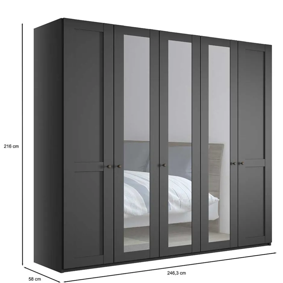 Ausgestattet mit fünf Drehtüren, erleichtert die Soft-Close-Funktion und die hochwertigen Metallbeschläge das Öffnen und Schließen des Schranks. Die Türfronten sind in einer dezenten Kassettenoptik gestaltet, was dem Kleiderschrank einen zusätzlichen Hauch von Eleganz verleiht. Ein besonderes Highlight sind die Ganzkörperspiegel, welche die mittleren drei Türfronten zieren. Sie bieten nicht nur einen praktischen Nutzen, sondern vergrößern auch optisch den Raum.