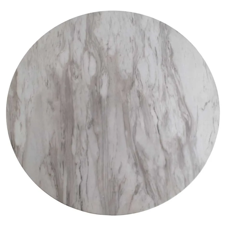 MDF bildet die Basis der runden Tischplatte, ein Material, das für seine hohe Formstabilität und Belastbarkeit bekannt ist. Die Oberfläche wurde mittels aufwendiger Folierung im Thermoverfahren mit einer hellgrau-weißen Marmoroptik versehen. Diese Technik sorgt nicht nur für eine beeindruckend realistische Marmor-Ästhetik, sondern macht die Tischplatte zudem kratzfest, widerstandsfähig und leicht zu reinigen.