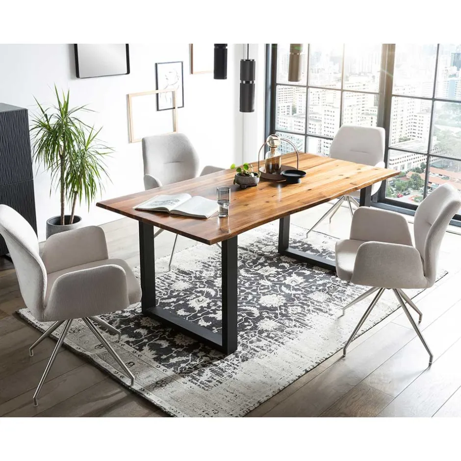 Das Herzstück dieser Esstisch Kombination ist der Tisch, dessen Platte aus hochwertigem Akazienholz gefertigt wurde. Die markante Baumkante verleiht ihm eine natürliche Optik, sodass jedes Exemplar ein Unikat ist. Mit einer soliden Stärke von 2,6 cm ist die Tischplatte besonders robust und widerstandsfähig gegen den täglichen Gebrauch. Die pflegeleichte Lackierung in Cognacbraun bringt die einzigartige Maserung des Holzes wunderbar zur Geltung und schützt die Oberfläche zugleich. Für einen spannenden Materialmix sorgt das schwarze Metall-Bügelgestell, das mit seiner stabilen Konstruktion und klaren Linien das Industrial-Design perfekt unterstreicht.