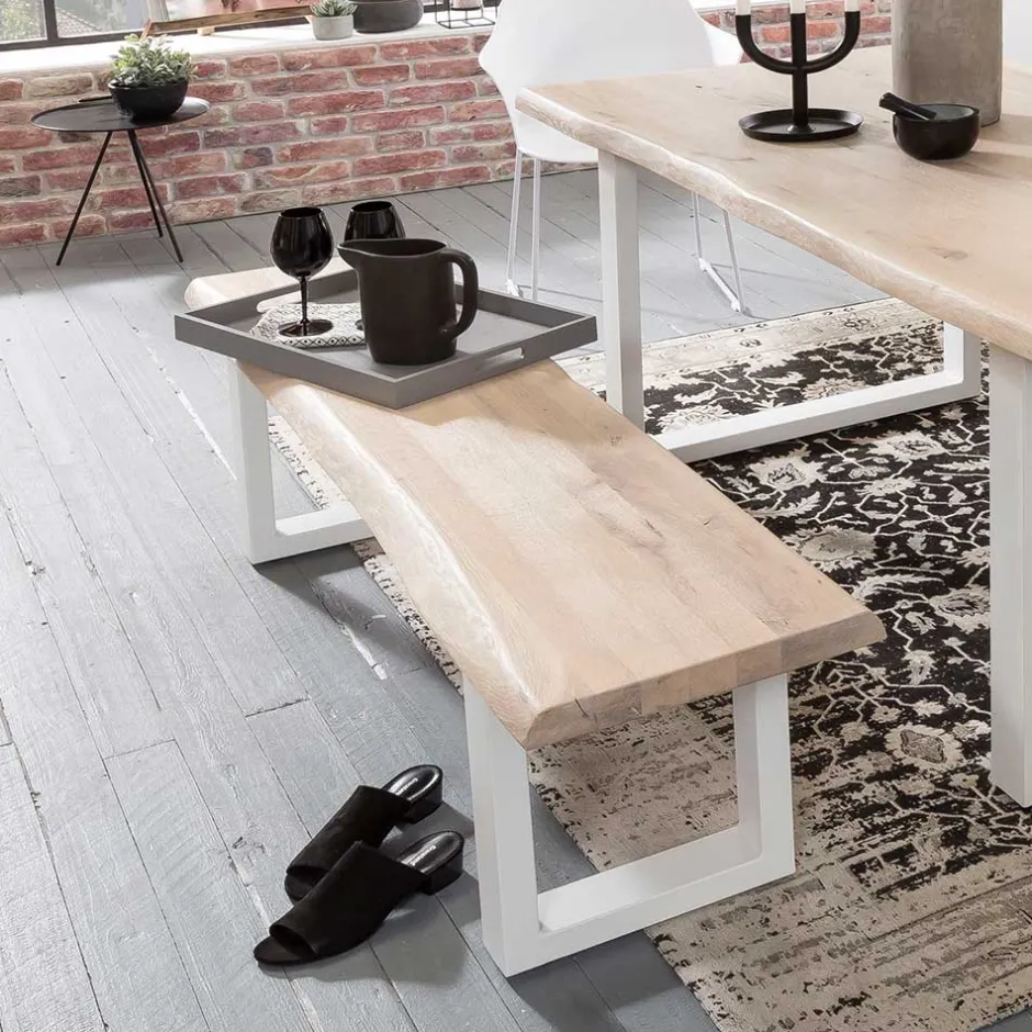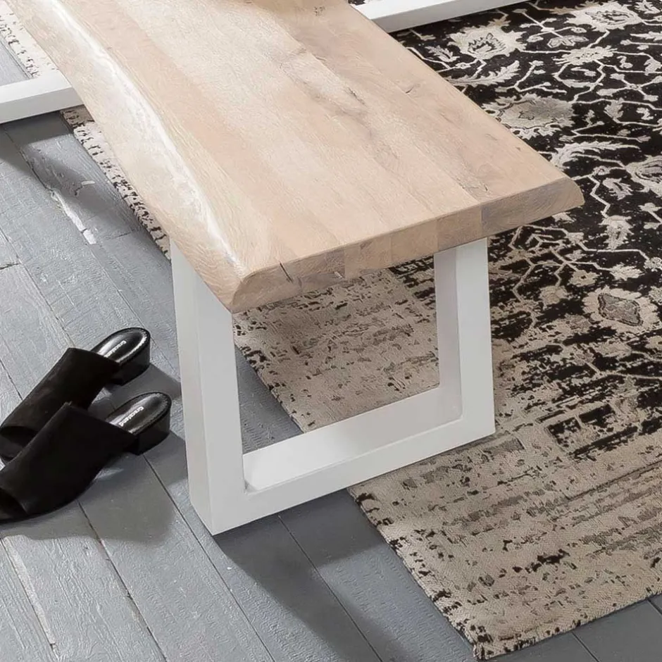 Die Essbank „Tilveta“ ist aus massivem Eichenholz und Metall gefertigt. Eiche ist nicht nur für seine Robustheit und Langlebigkeit bekannt, sondern auch für seine natürliche Schönheit. Das Holz besitzt eine einzigartige Maserung und eine warme Farbgebung, die Ihrem Essbereich einen Hauch von Natürlichkeit verleiht. Darüber hinaus sorgt die geölte Holzoberfläche, behandelt mit einem White-Wash Effekt, für eine angenehme Haptik und schützt das Holz vor Verschleiß. Der White-Wash Effekt verleiht dem Holz eine helle und gleichzeitig rustikale Optik, die perfekt zum Industry und Loft Stil passt.