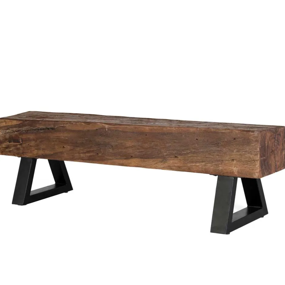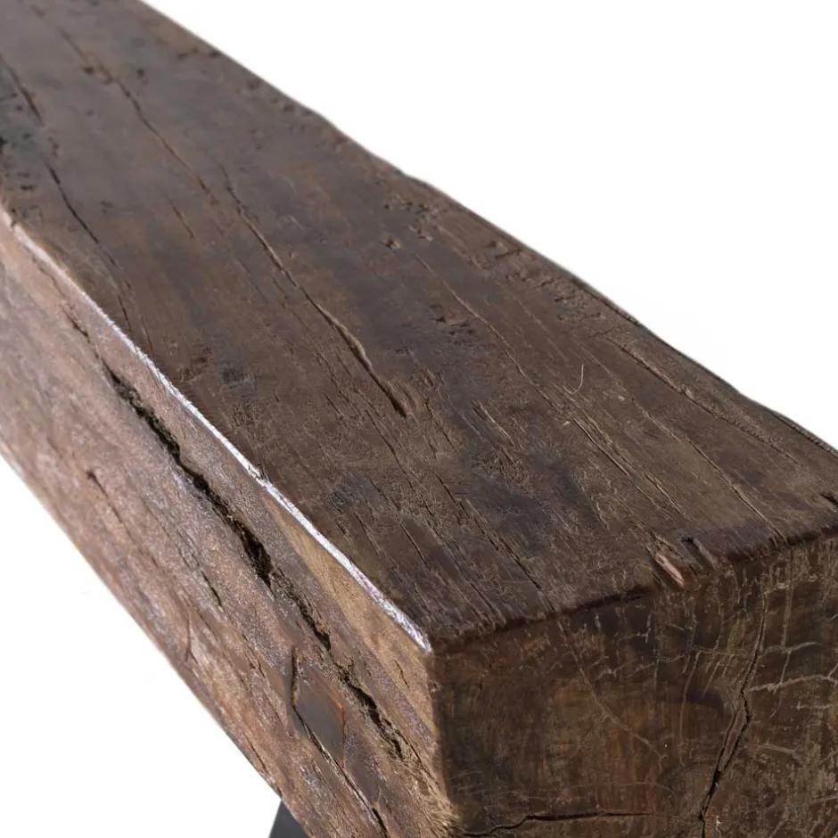Jede „Evinele“ Bank erzählt ihre eigene Geschichte: Der Sitz besteht aus einem massiven Balken aus hochwertigem Recyclingholz, das durch seine grobe Struktur, Risse, Astlöcher und natürliche Unebenheiten seinen ganz besonderen Charakter erhält. Diese Spuren des Lebens verleihen dem Möbelstück einen authentischen, charmanten Look – jede Bank ist ein handgefertigtes Unikat mit einzigartiger Maserung und Patina.