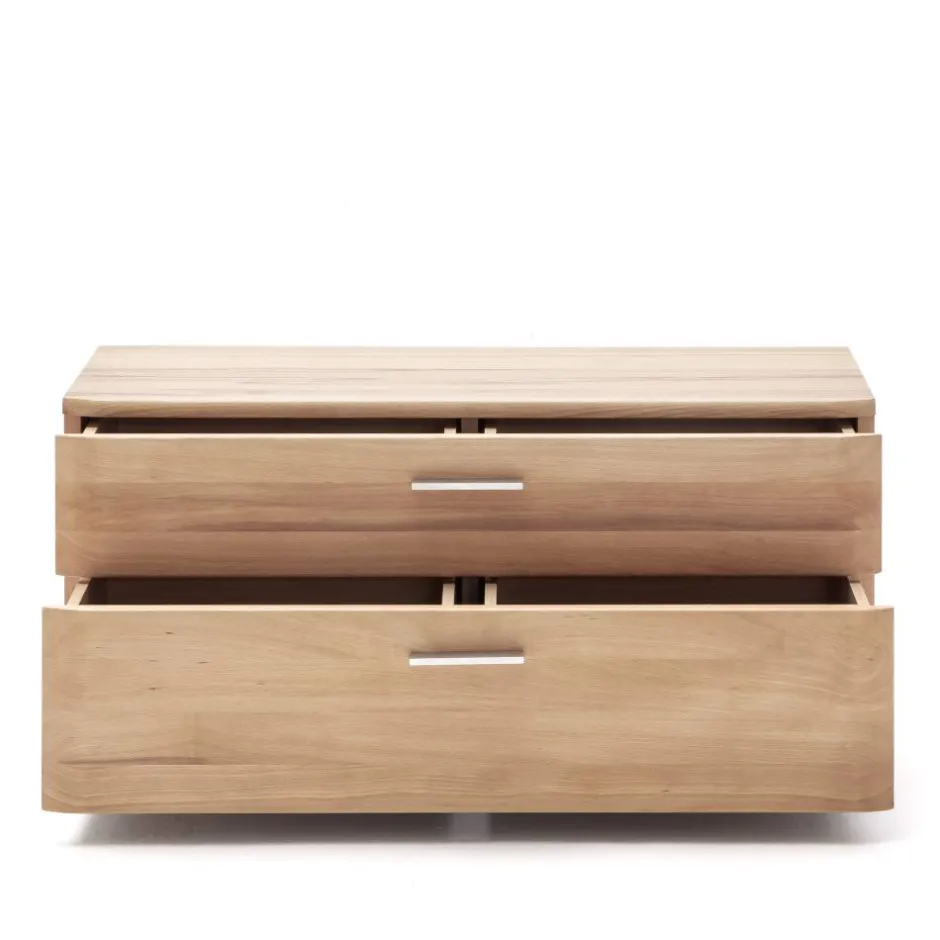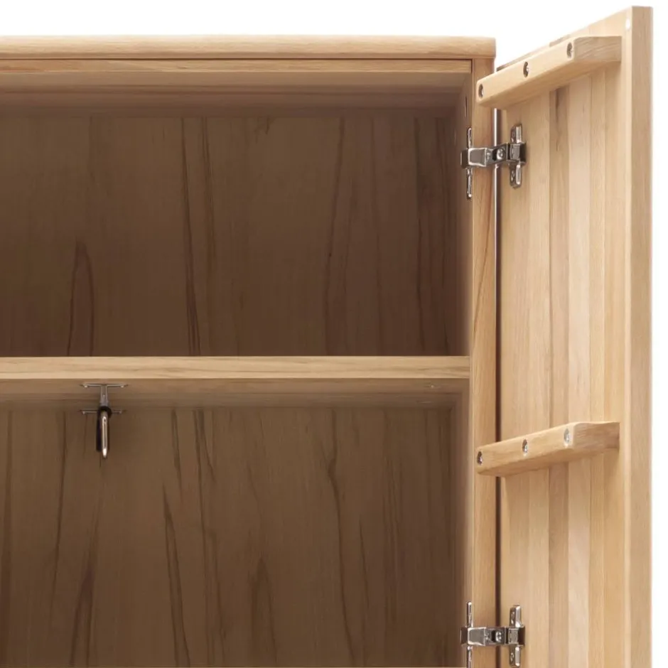 Das teilmassive Set kombiniert Kernbuche Massivholz (Front) mit echtholzfurnierten Spanplatten (Korpus) und Spiegelglas. Alle Holzoberflächen sind geölt, was die natürliche Struktur hervorhebt und für einen edlen Look sorgt. Silberfarbige Metall-Griffleisten und hochwertige Metallbeschläge runden das elegante Design ab.