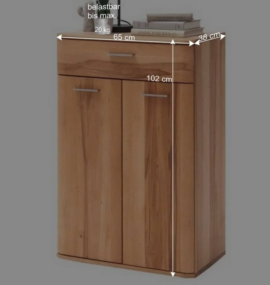 - Teilmassiv aus Kernbuche Massivholz (Front), Spanplatte (Korpus) und Spiegelglas gefertigt