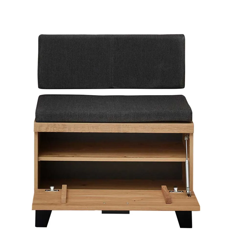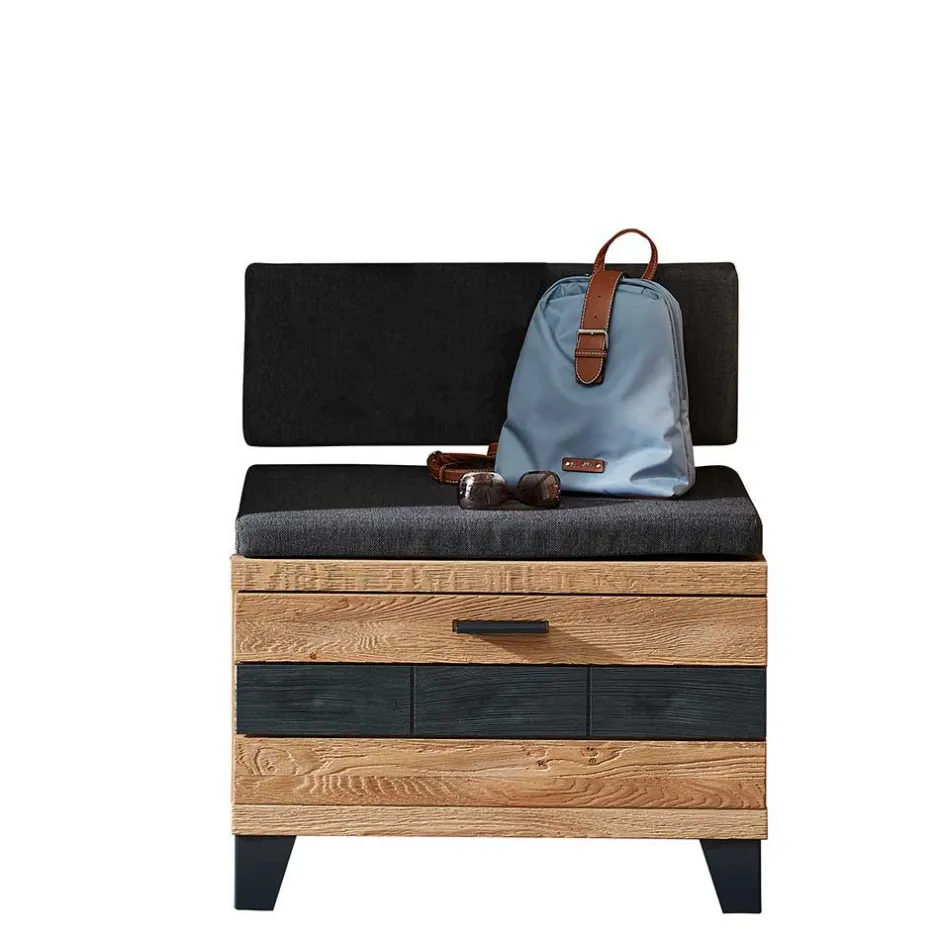 - Massivholz geschroppt und lackiert, Absetzung in Dunkelgrau, durchgehende Lamellen, Spanplatte foliert in Holzoptik, Metall pulverbeschichtet in Anthrazit