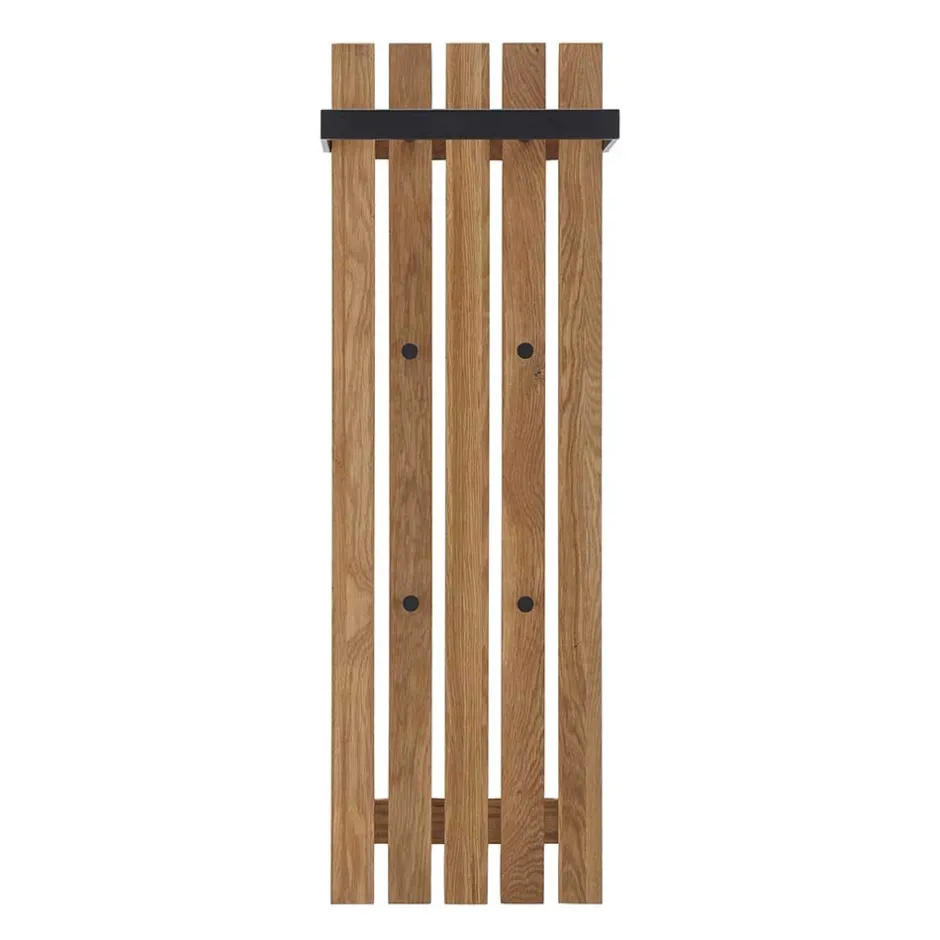 Das Garderobenpaneel „Gangizo“ setzt auf die perfekte Verbindung von Massivholz und Metall. Die fünf vertikalen Eichenholzleisten, die jeweils eine beeindruckende Stärke von 6 cm aufweisen, sind auf zwei horizontalen Leisten aus dem gleichen Material befestigt. Die Holzoberflächen sind natürlich geölt, was das Eichenholz nicht nur vor äußeren Einflüssen schützt, sondern auch seine charakteristische Färbung und Maserung besonders gut zur Geltung bringt. Die schwarzen Knopf-Kleiderhaken und die ebenfalls schwarze Hutablage aus Metall bieten einen gelungenen Kontrast zum warmen Naturton der Eiche und sorgen für eine optisch ansprechende, zugleich aber auch robuste und langlebige Aufhängemöglichkeit für Jacken, Mäntel und Accessoires.