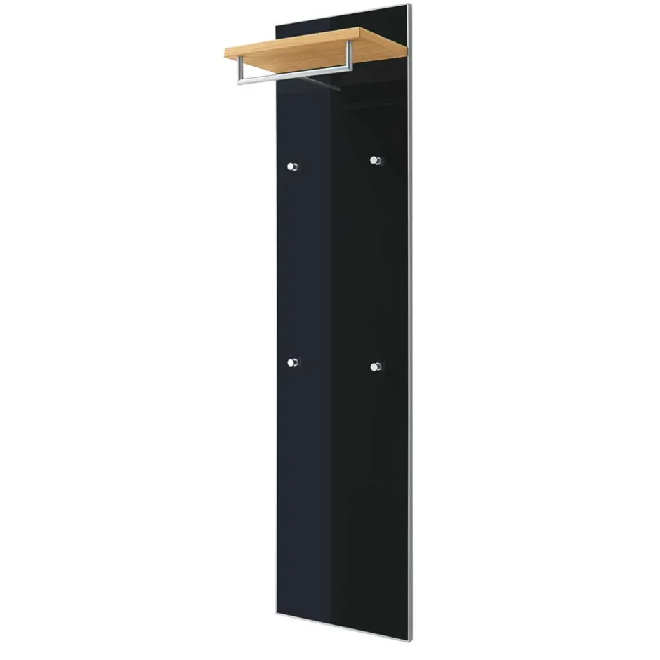 Mit kompakten Maßen von 42 cm Breite, 170 cm Höhe und 27 cm Tiefe ist „Lalaika“ die ideale Lösung für jeden Eingangsbereich – ob groß oder klein. Dank der durchgehenden Rückwand wirkt das Paneel besonders elegant und aufgeräumt. Die integrierte U-förmige Kleiderstange aus robustem, chromfarbenem Metall bietet optimalen Platz für Ihre Garderobe, während vier runde, glänzende Kleiderhaken zusätzlichen Stauraum für Jacken, Taschen oder Schals bieten. So haben Sie stets alles griffbereit und schaffen gleichzeitig eine klare und ansprechende Atmosphäre.
