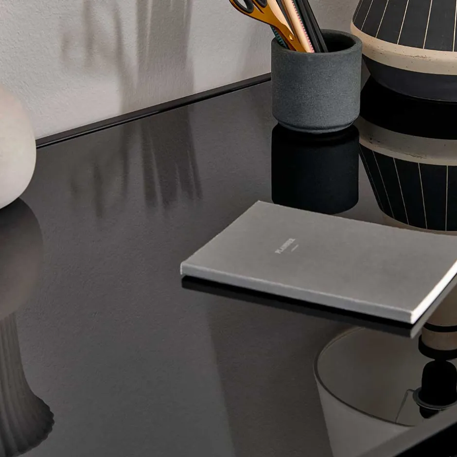 Der Glasschreibtisch „Pathos“ überzeugt durch seine durchdachte Materialwahl. Die Tischplatte aus Sicherheitsglas bietet nicht nur eine elegante Oberfläche, sondern ist auch bis zu 20 kg belastbar. Das schwarze, pulverbeschichtete Bügelgestell aus Stahl sorgt für Stabilität und verleiht dem Tisch seine markante Silhouette. Pflegeleichte Oberflächen machen die Reinigung zum Kinderspiel und bewahren den edlen Look über lange Zeit.