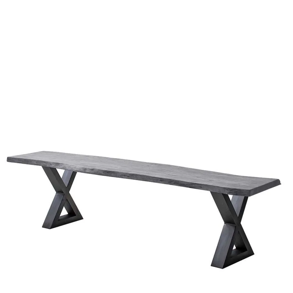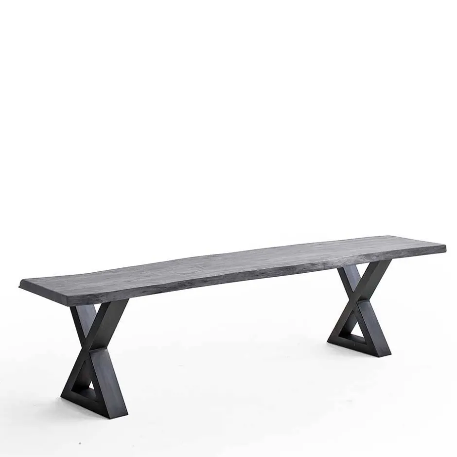 Die X-förmigen Beine aus Metall sind in Anthrazit lackiert und bieten durch ihre breite, durchgehende Bodenauflage maximale Stabilität. Diese markanten Beine unterstreichen den industriellen Look der Bank und sorgen gleichzeitig für einen sicheren Stand.