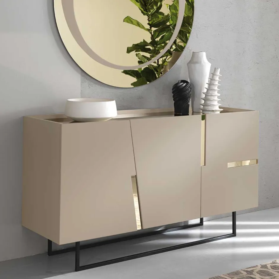 - Front in Taupe lackiert, Korpus melaminbeschichtet, Oberplatte und Akzente mit bronzefarbigem Spiegelglas beschichtet