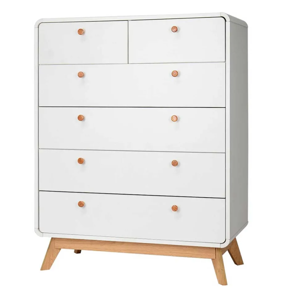 Mit einer Breite von 81 cm, einer Höhe von 104 cm und einer Tiefe von 39 cm bietet die Kommode „Kolreva“ jede Menge Platz für Ihre persönlichen Dinge. Sechs geräumige Schubladen mit leichtgängigen Metallauszügen sorgen dafür, dass alles ordentlich verstaut werden kann – sei es Kleidung, Dokumente oder andere Alltagsgegenstände. Die runden Holz-Knopfgriffe unterstreichen den natürlichen Look und ermöglichen ein komfortables Öffnen und Schließen der Schubladen.
