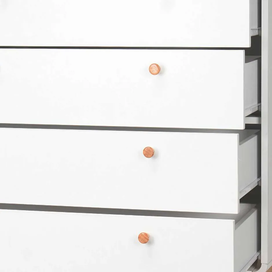 Die weiße Folierung verleiht der Kommode nicht nur ein edles Finish, sondern macht sie auch besonders pflegeleicht. Fingerabdrücke, Staub oder leichte Verschmutzungen lassen sich mit einem feuchten Tuch im Handumdrehen entfernen. Dank dieser Oberfläche bleibt das Möbelstück auch nach Jahren noch strahlend schön und behält seine makellose Optik.