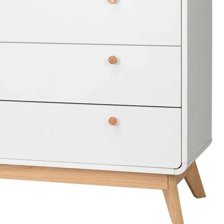Die leicht schräg gestellten Beine in Eichenholzoptik setzen einen ansprechenden Kontrast zur weißen Oberfläche und verleihen der Kommode ihren charmanten skandinavischen Charakter. Sie sorgen zudem für eine angenehme Höhe und eine luftige Leichtigkeit, die den Raum optisch vergrößert.