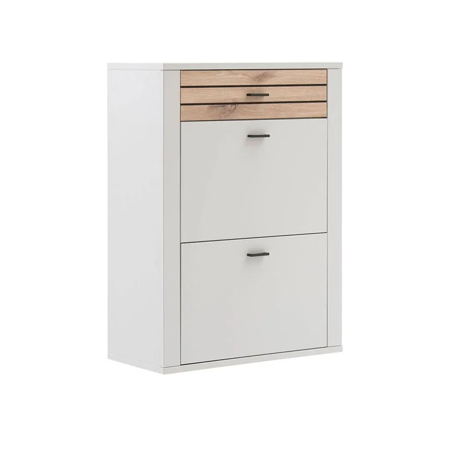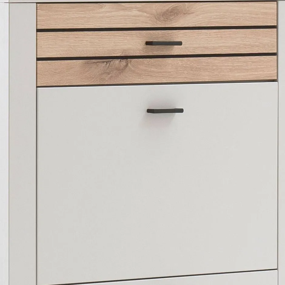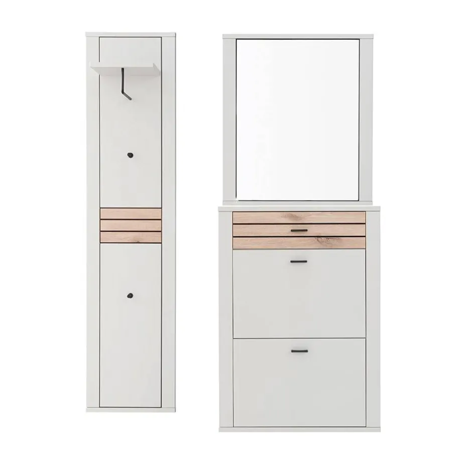 Die schmale Garderobe bietet durch zwei stabile Metall-Kleiderhaken und eine Hutablage mit Metall-Kleiderstange praktischen Stauraum für Jacken und Accessoires. Der Schuhkipper ermöglicht eine geordnete Aufbewahrung von Schuhen durch zwei gedämpfte Schuhklappen mit integrierten Doppel-Metallschuhkörben. Der 73 cm breite Spiegel ergänzt das Set durch seine großzügige Reflexionsfläche und vergrößert optisch den Raum.